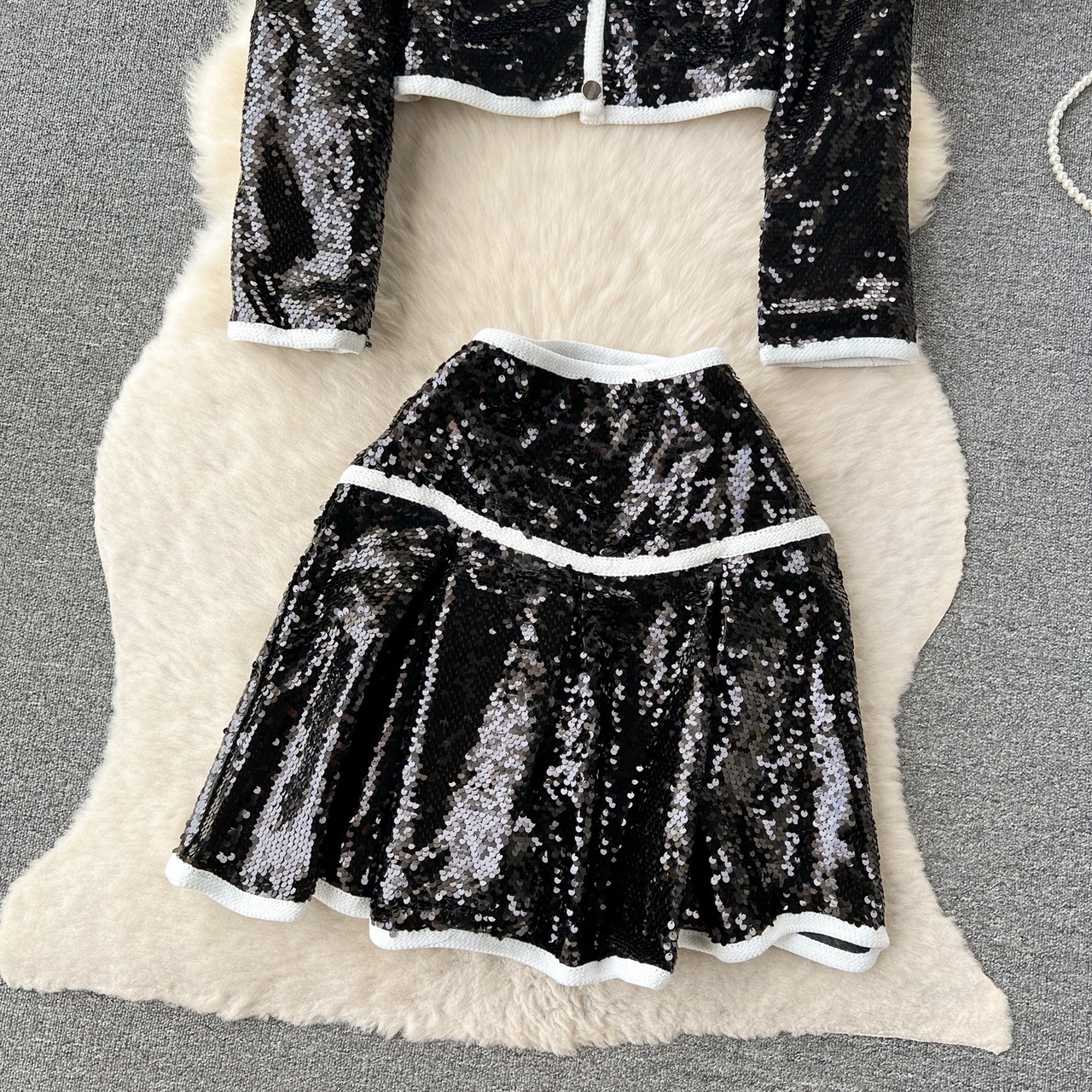 スーツレディース、フレンチレトロスタイル、ラウンドネック、ショートコート、ハイウエストスカート、スパンコールキラキラ2点セット ハイウェスト Oネック lyxaj96762926444