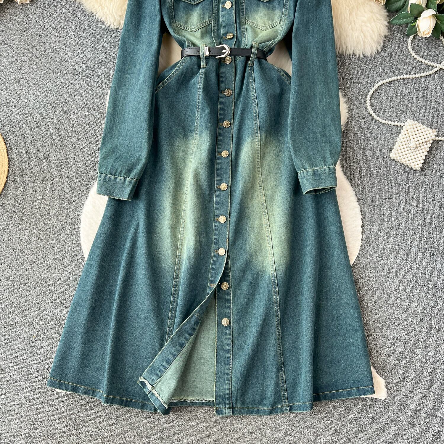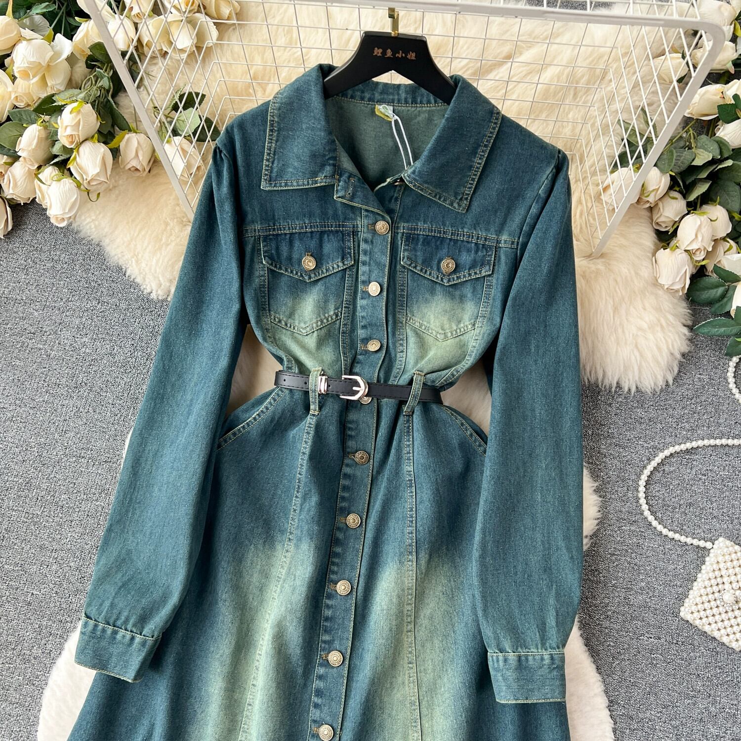 秋のレトロな高級デニムドレスの女性、シングルブレスト、ダメージ加工のデザイン、ニッチで美しく妖精のようなスカート オータム 秋物 lyxaj19237922522