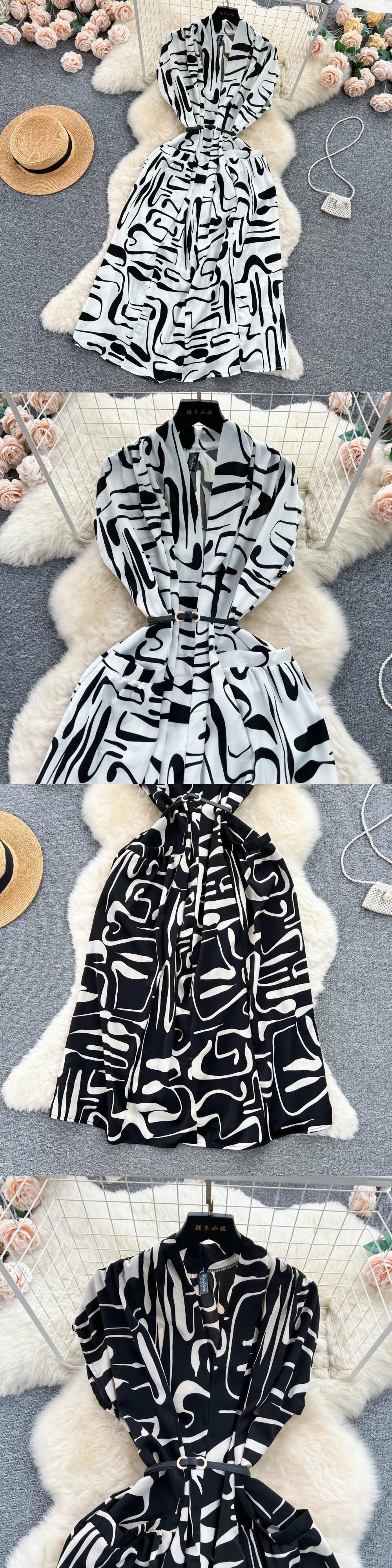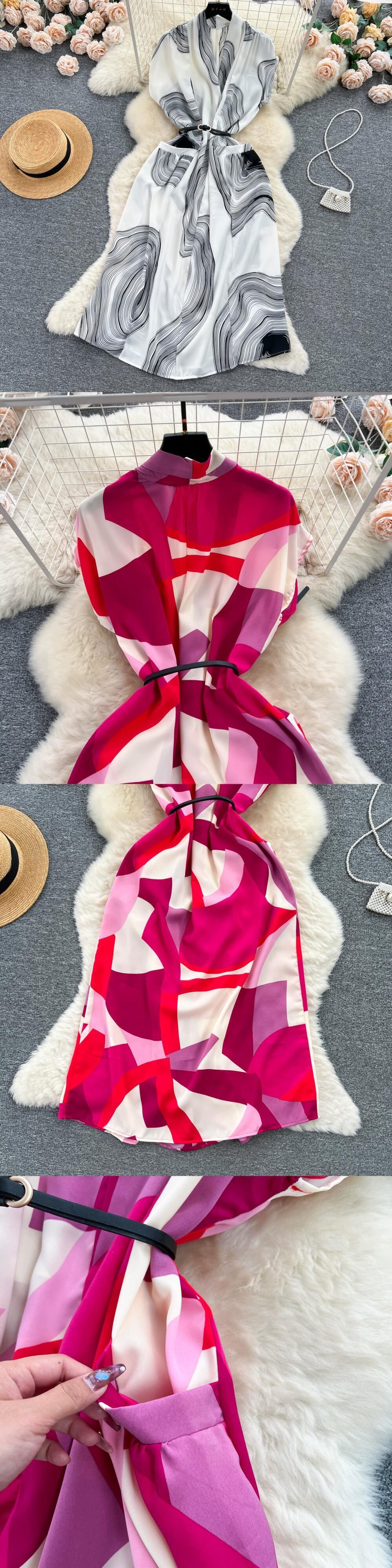 ライトラグジュアリーレトロ V ネックプリントドレス女性夏フレンチレースアップウエストルーズ痩身ミッドレングスシャツドレス サマー 夏物 Vネック lyxaj15795141275