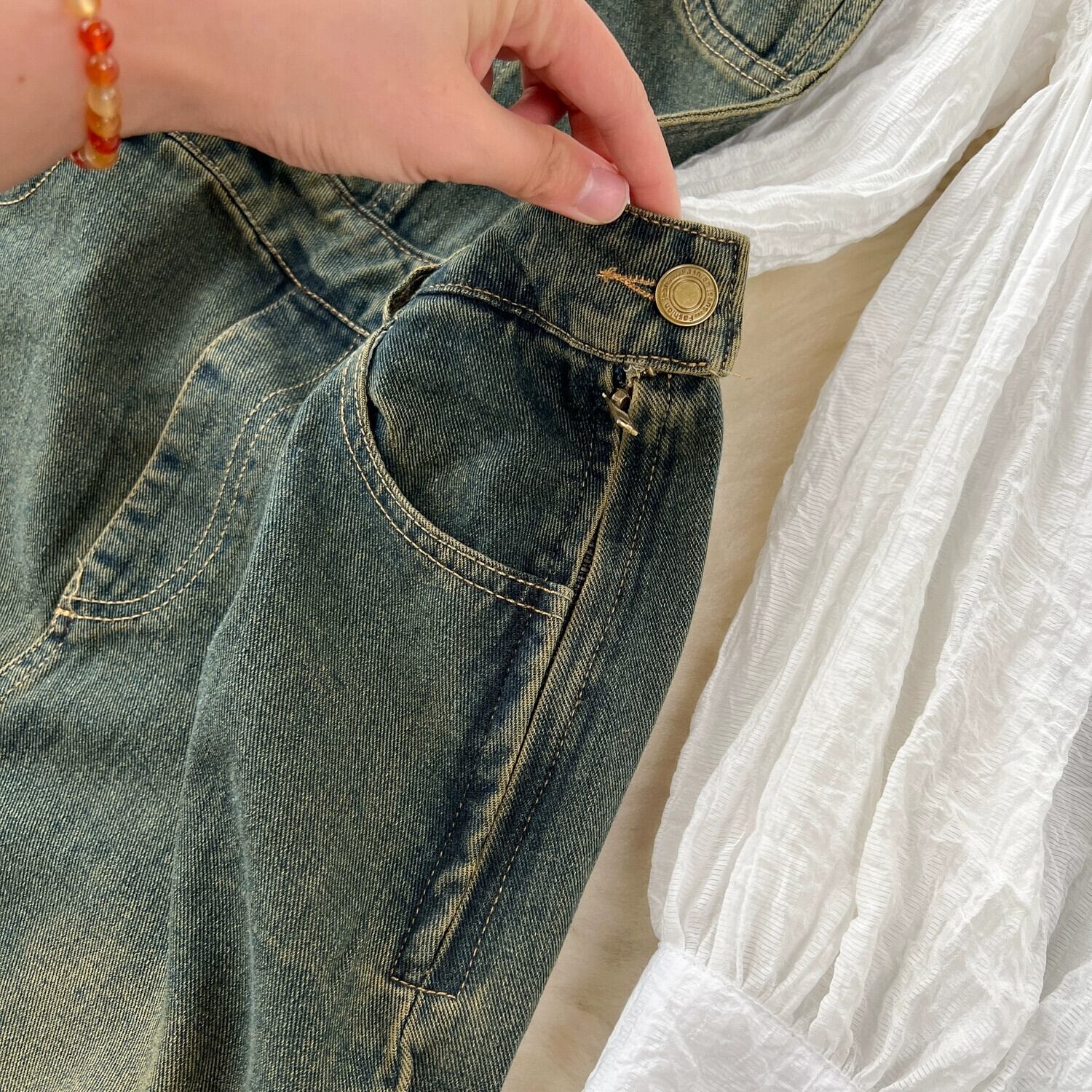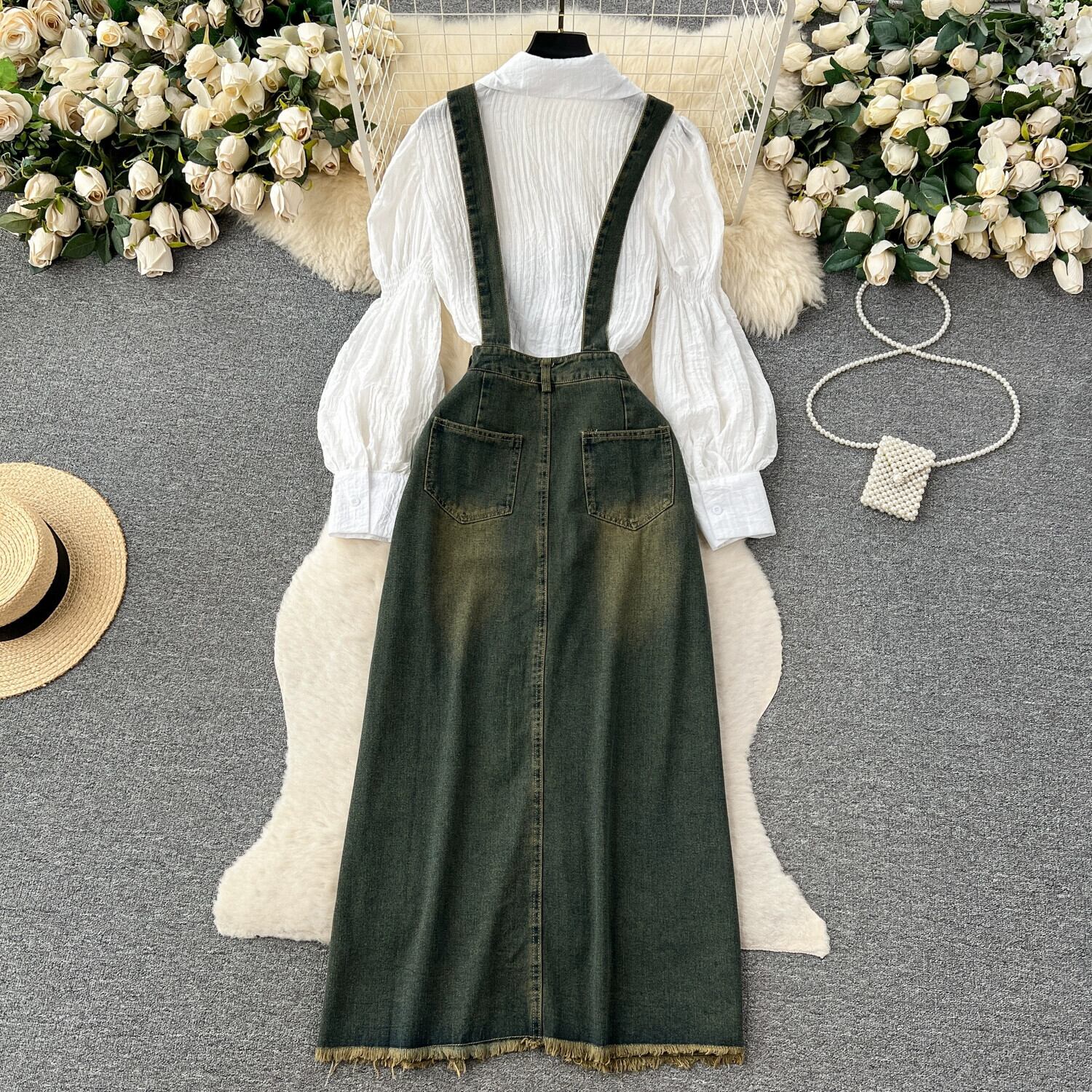 秋と冬のヨーロッパとアメリカのレトロなスタイルのサスペンダーデニムドレス + ダメージ加工長袖シャツトップツーピーススーツの女性 ロング オータム 秋物 ウィンター 冬物 ヨーロピアン lyxaj81123527536