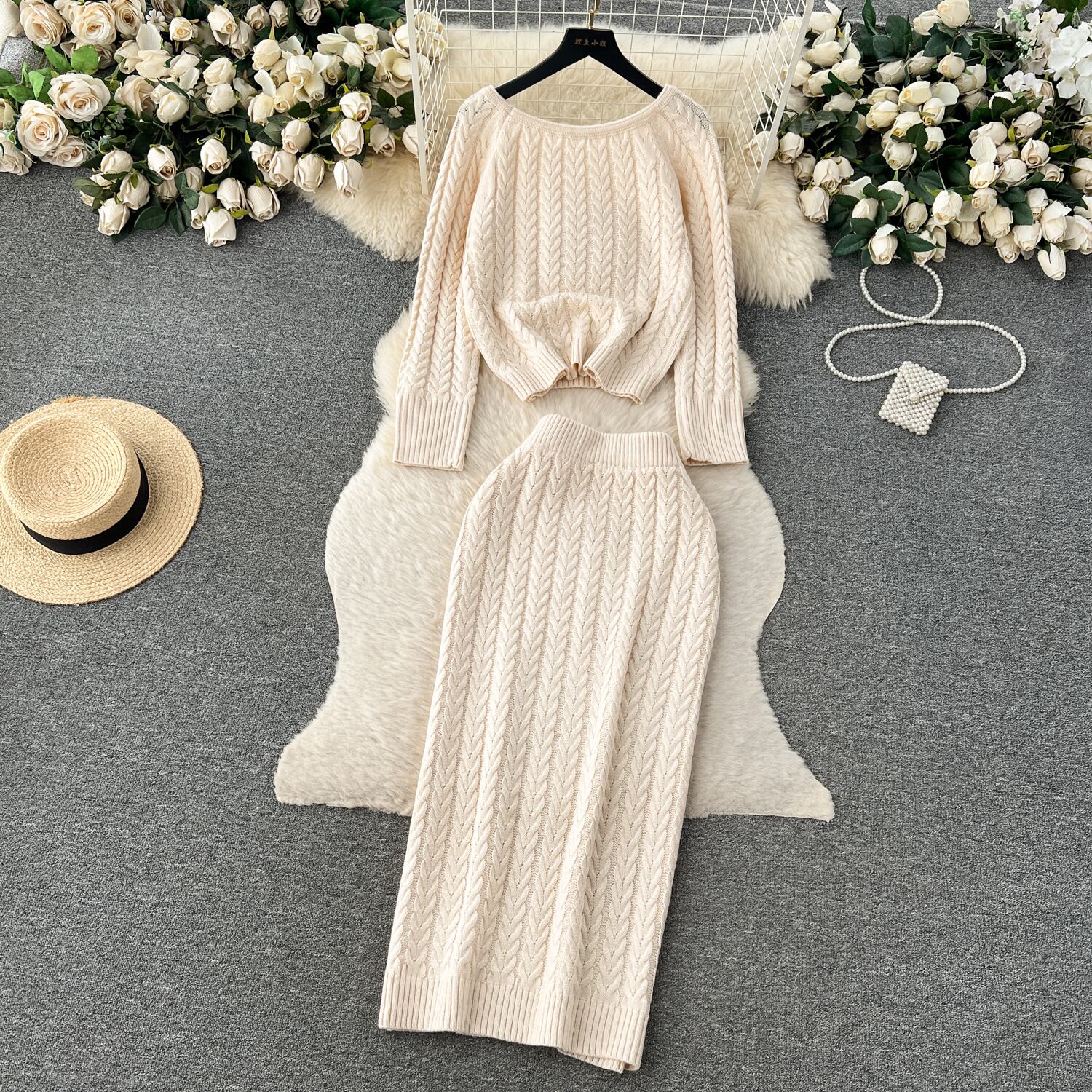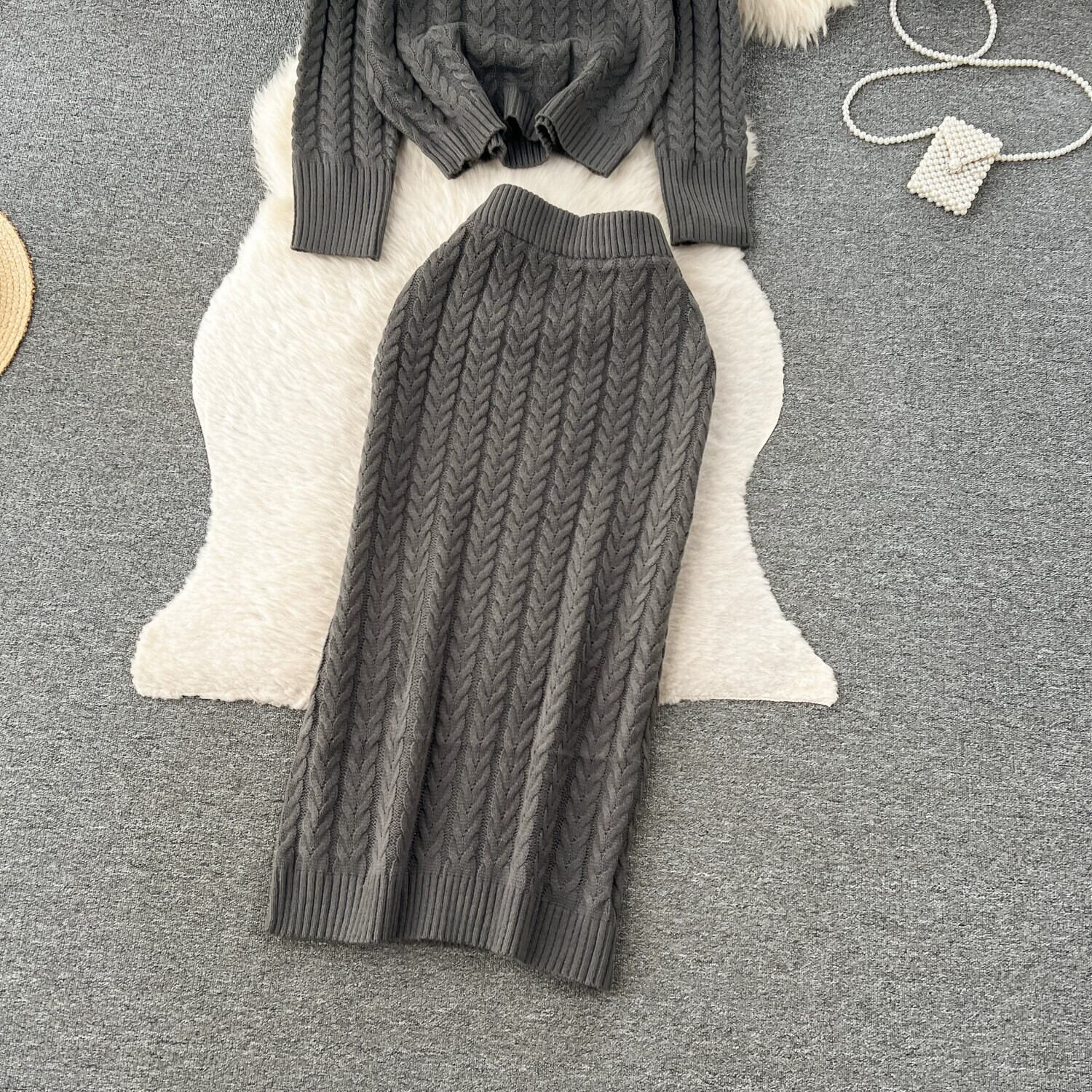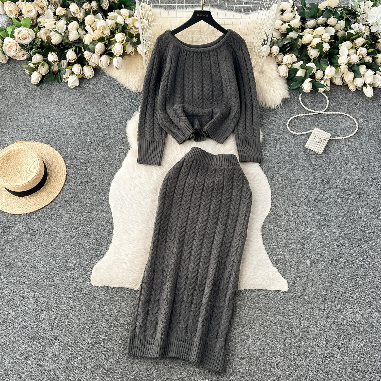 秋と冬のメイラードスタイルのニットスーツの女性、ラウンドネック、怠惰なプルオーバー、ツイストセーター、ハイウエストとヒップスカート ハイウェスト オータム 秋物 ウィンター 冬物 Oネック lyxaj24365417480