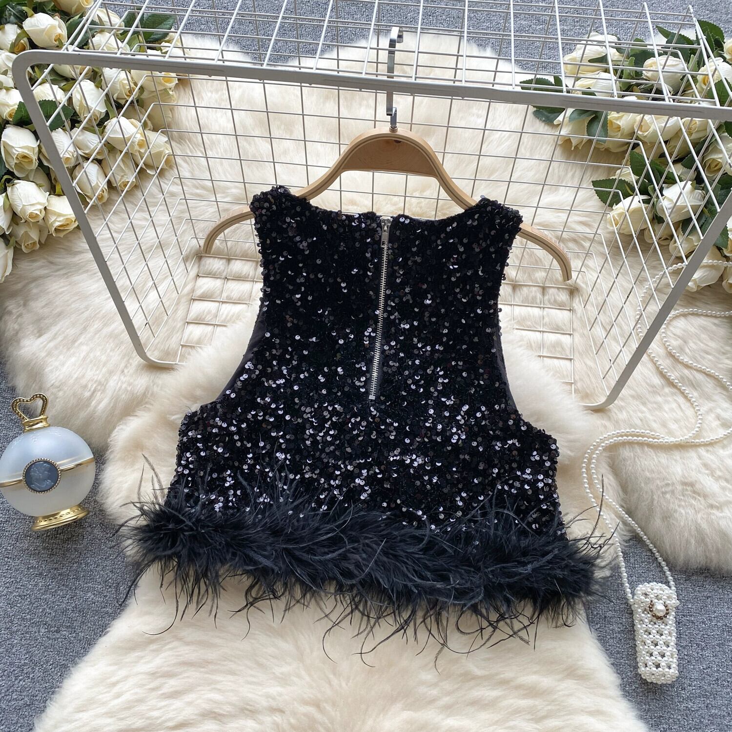 社交家のハイエンドのラウンドネックノースリーブスパンコールグリッターベストレディース毛皮のようなスプライシングショートシックトップ Oネック lyxaj2056967736