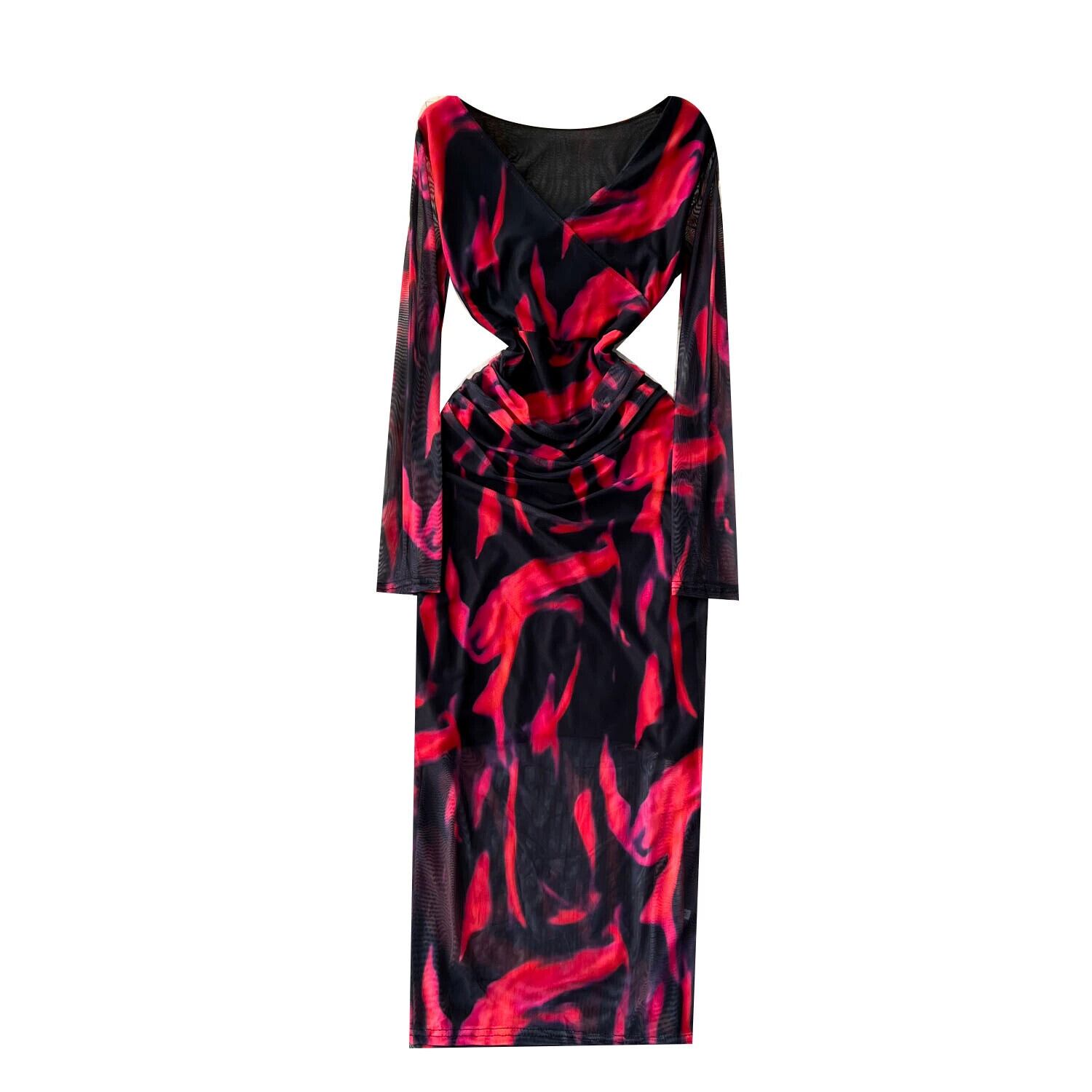 ニッチハイエンド長袖 V ネック汚れたプリントメッシュドレス秋の女性の薄いタイトフィットヒップハグスカート ロング オータム 秋物 Vネック lyxaj4085528370