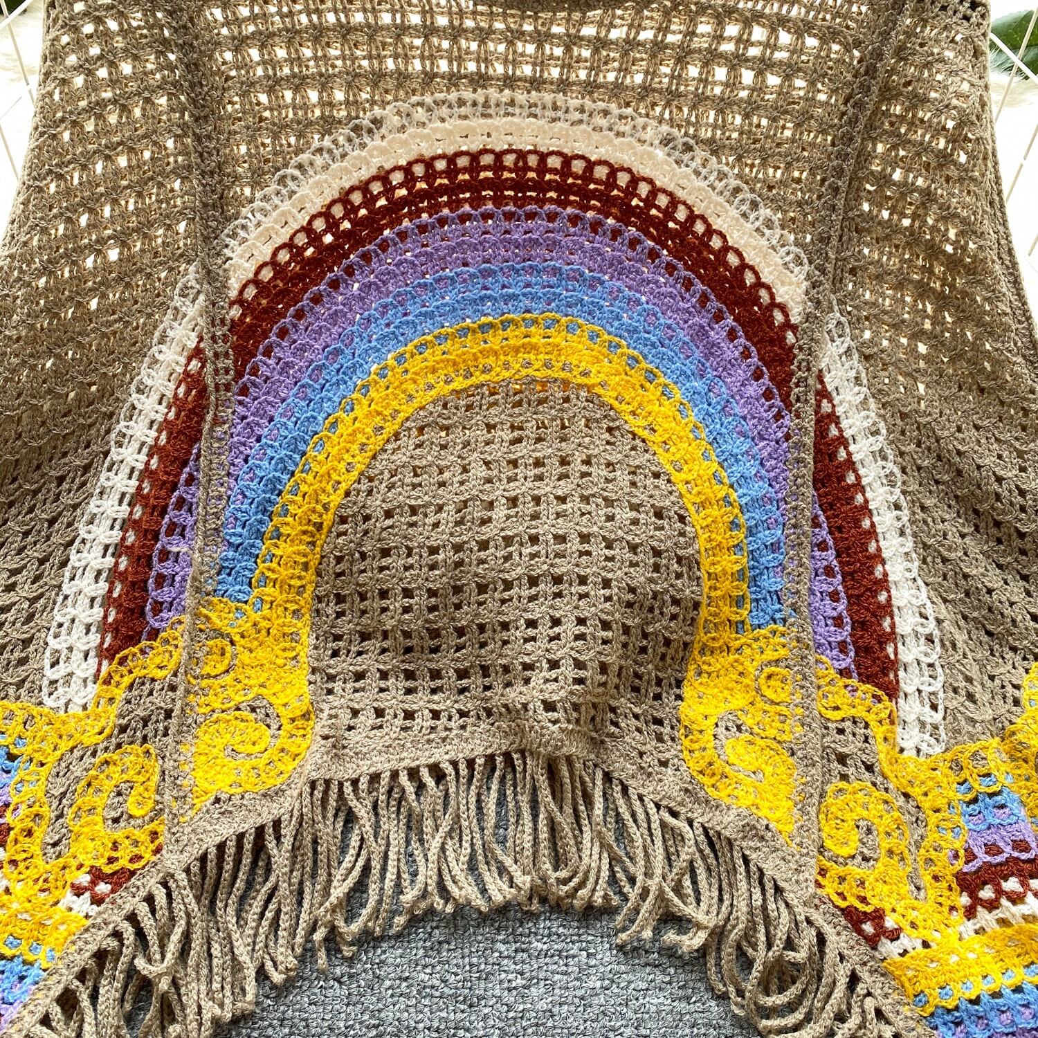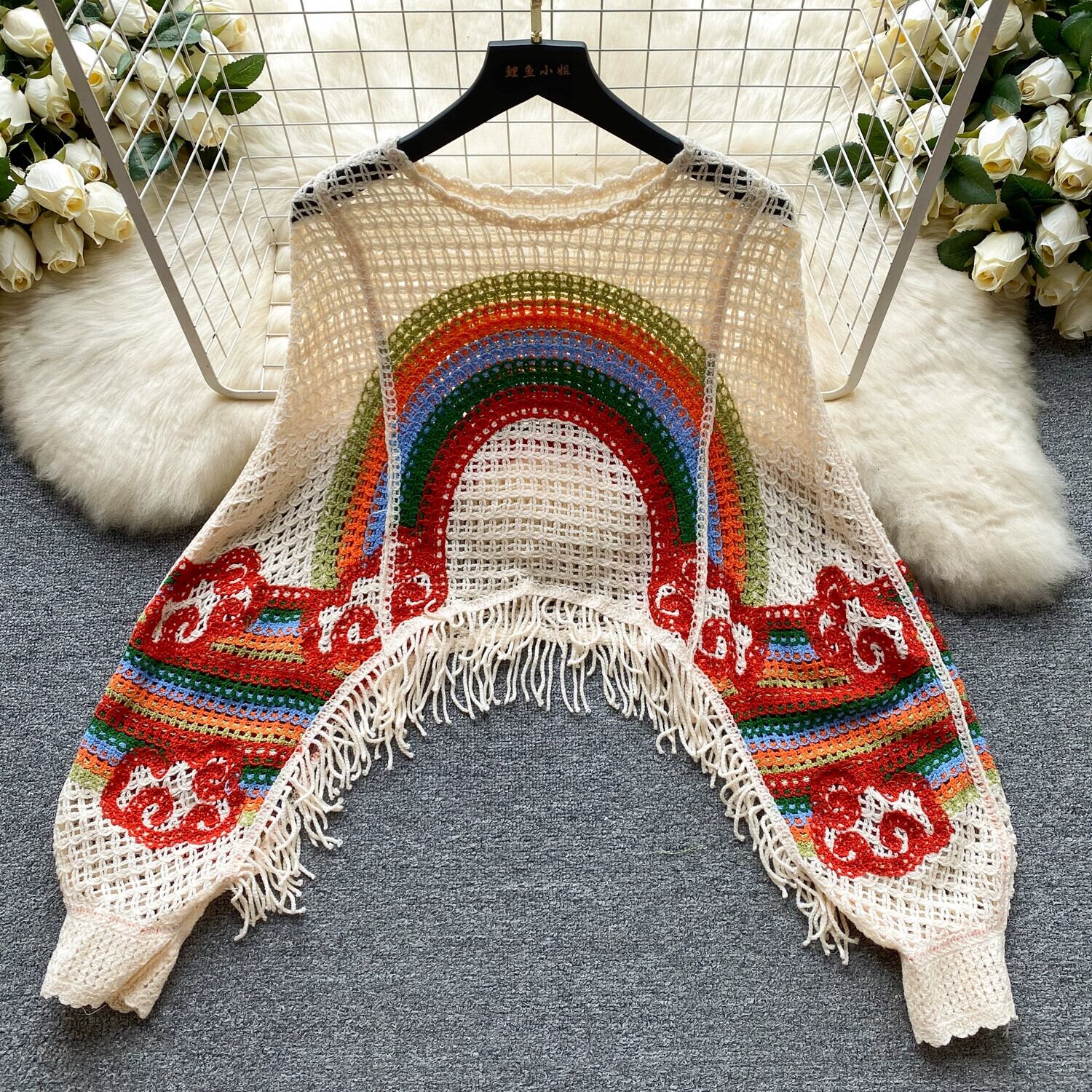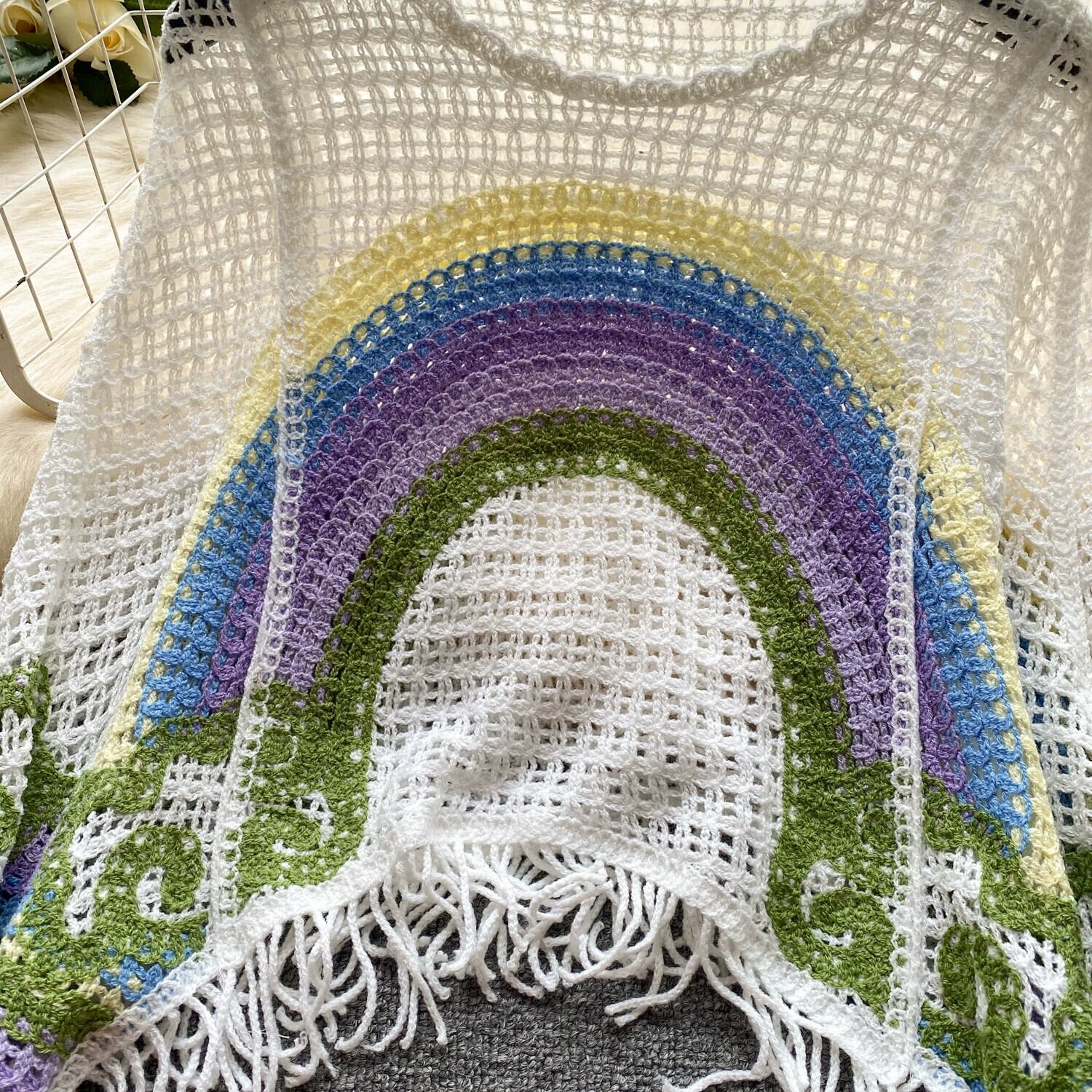 ニッチなホリデースタイルのレインボープリント中空ニットブラウスレディース、怠惰、ルーズ、カジュアル、多用途、シックなアウタートップ lyxaj45343420862
