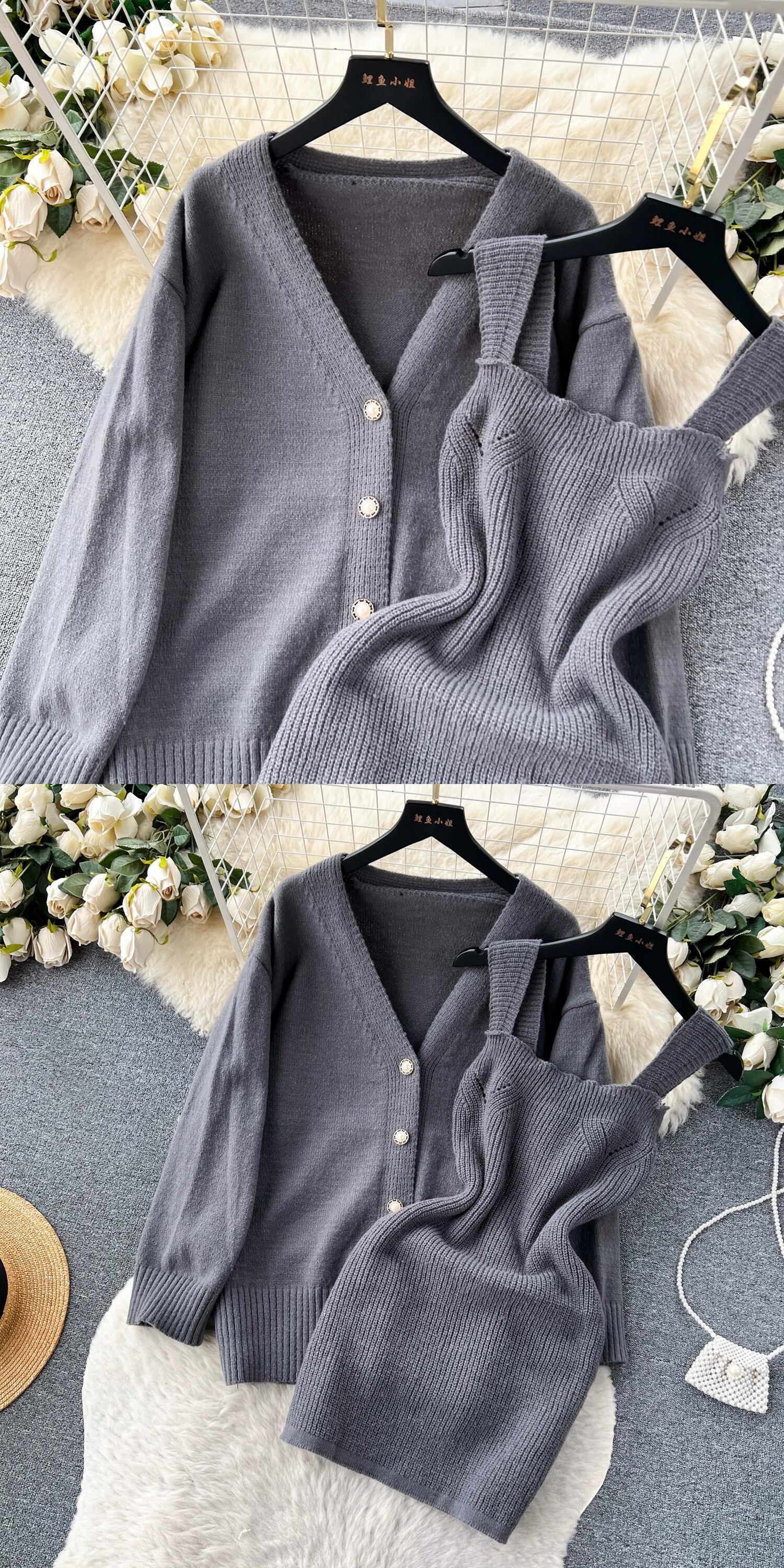 秋冬のメイラード衣装の女性:フレンチスタイルの怠惰なスタイルのルーズニットカーディガンジャケットとスリムサスペンダーセータースカート オータム 秋物 ウィンター 冬物 lyxaj79284149701