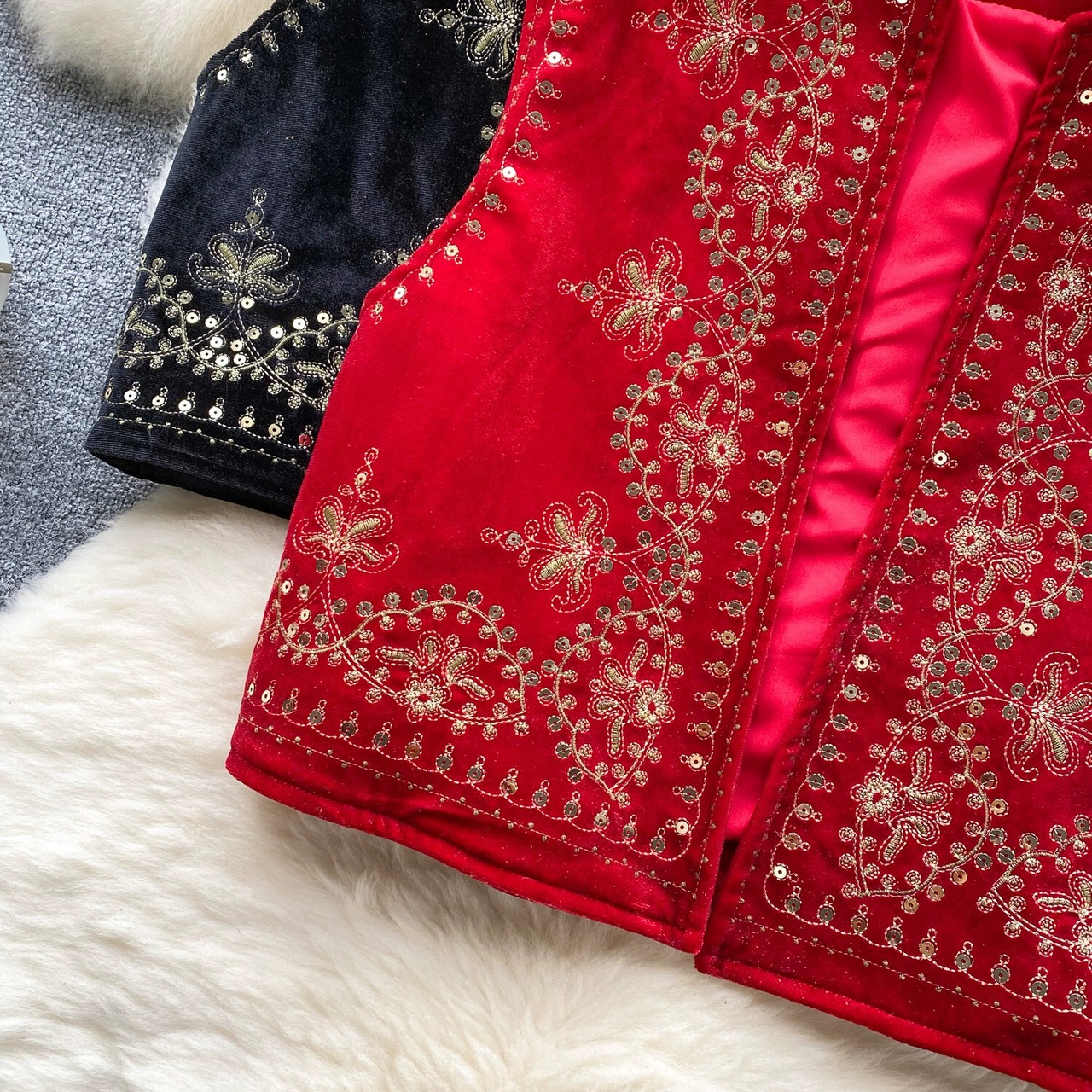 ニッチレトロエスニックスタイル重工業スパンコール刺繍ベストベストレディースファッション多用途アウターショートチョッキジャケット レッド lyxaj91265732009