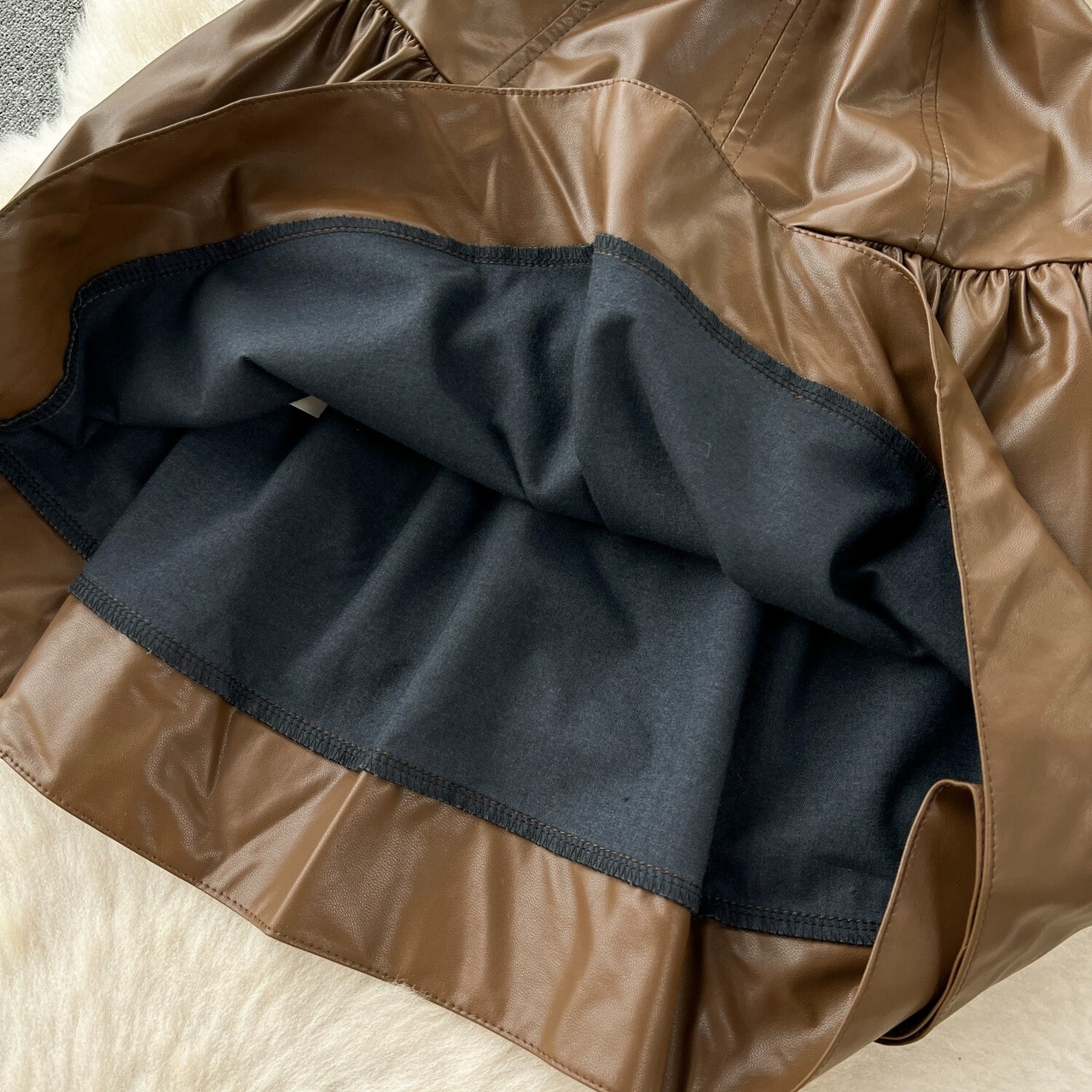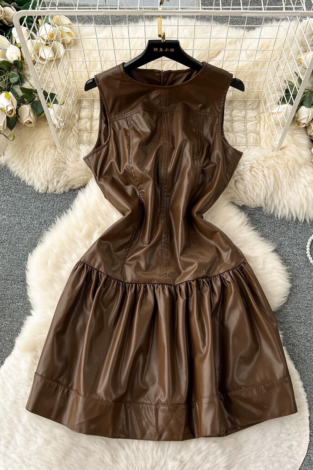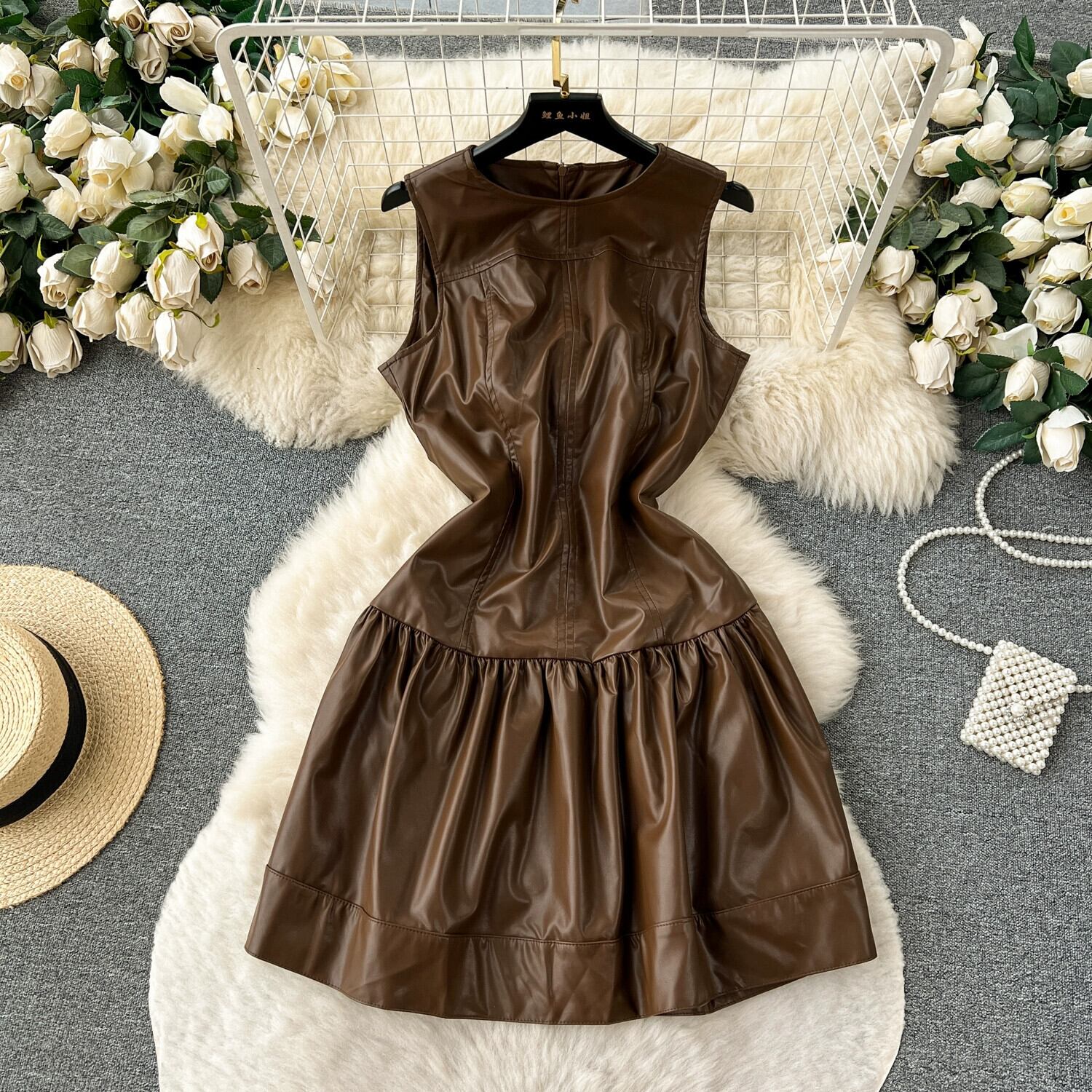 初秋の新スタイル香港スタイルのレトロなラウンドネックノースリーブプリーツウエスト痩身ファッショナブルなストリート PU レザードレスの女性 オータム 秋物 Oネック lyxaj24345647670