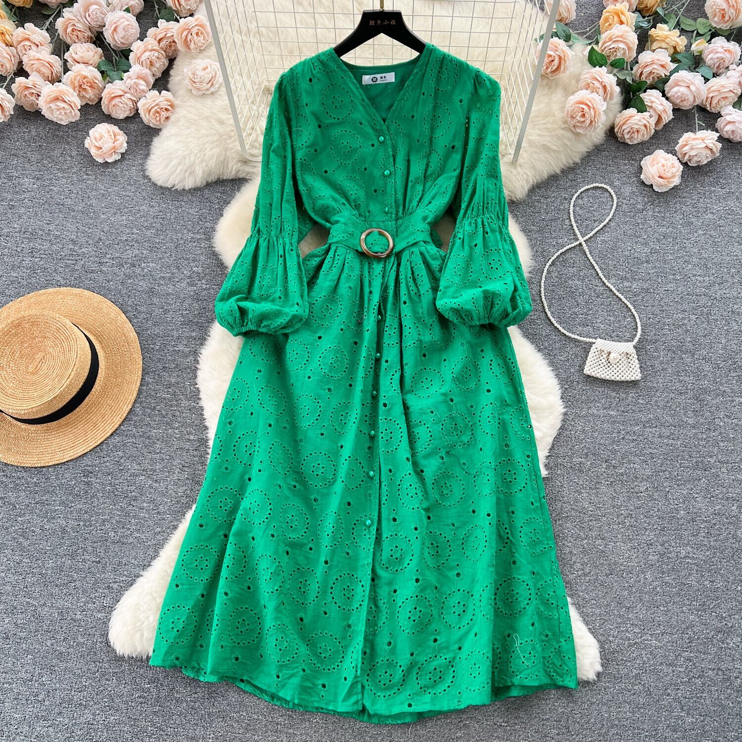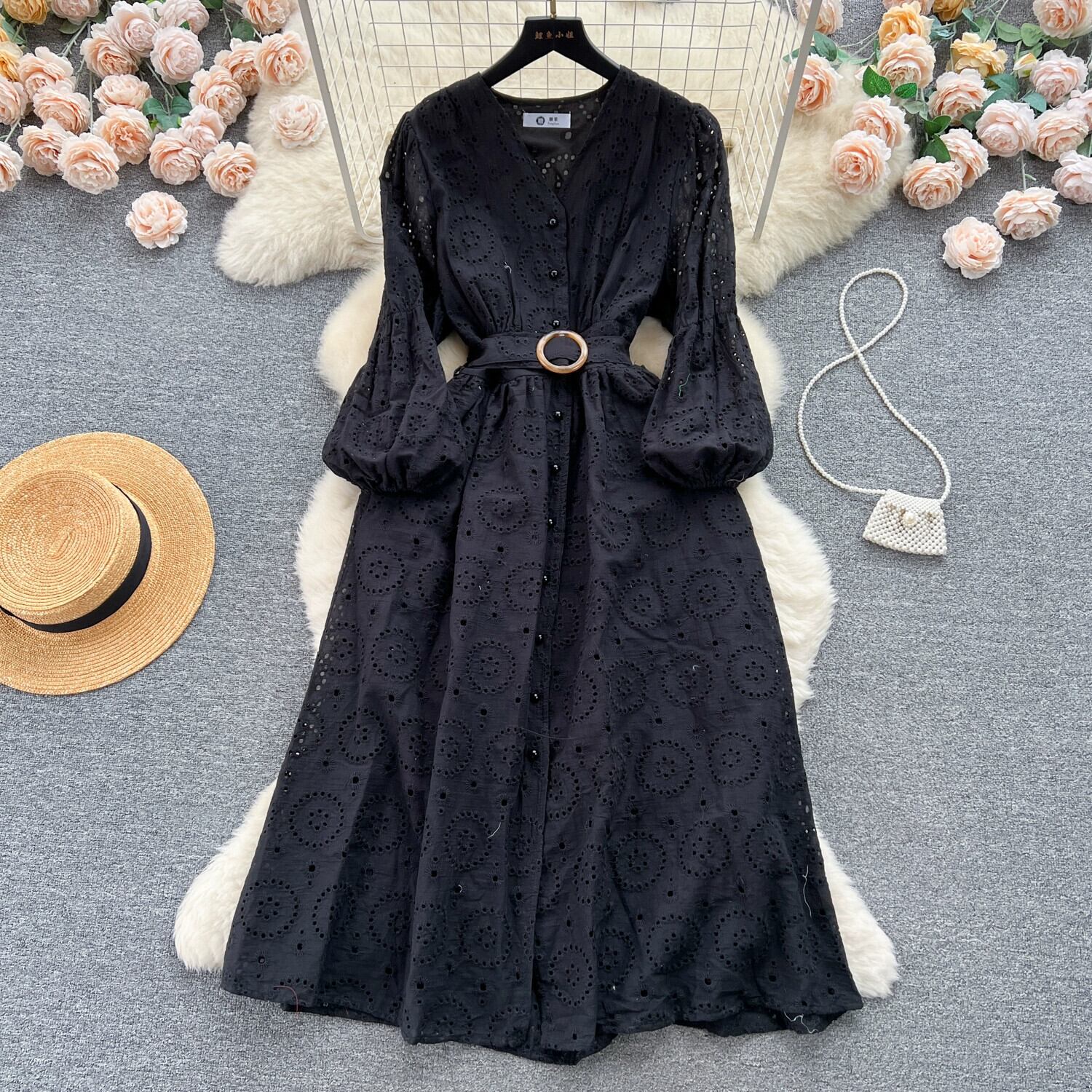 甘い重工業中空かぎ針編みレースドレス女性の秋のレースアップウエスト長袖シングルブレスト妖精ドレスビッグスイング ロング 大人ガーリー スウィート キュート カジュアル オータム 秋物 lyxaj1107357049