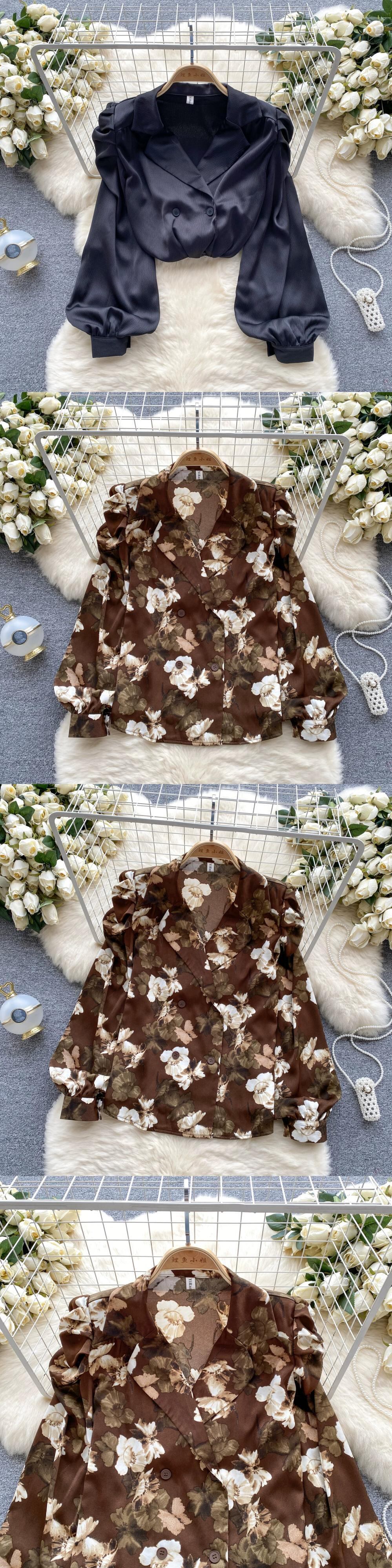 初秋のライトフレンチプリーツパフスリーブスーツカラー花柄シャツレディース、ファッショナブルで多用途、ユニークなニッチシフォントップ オータム 秋物 lyxaj3084982101