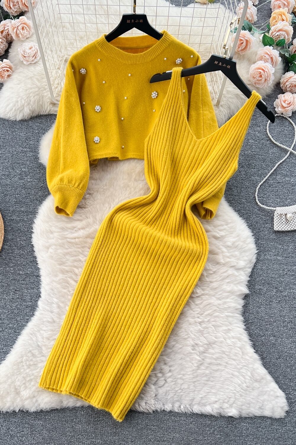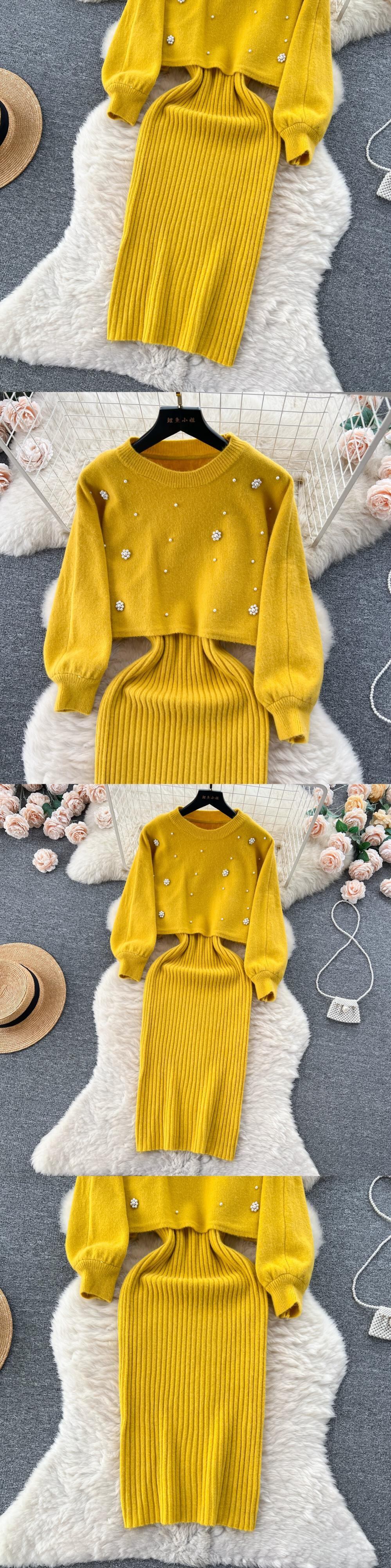 秋冬の痩身・老化防止2点セットレディース、ラウンドネックビーズショートセーター+ウエストニットベストドレス オータム 秋物 ウィンター 冬物 Oネック lyxaj22413927527