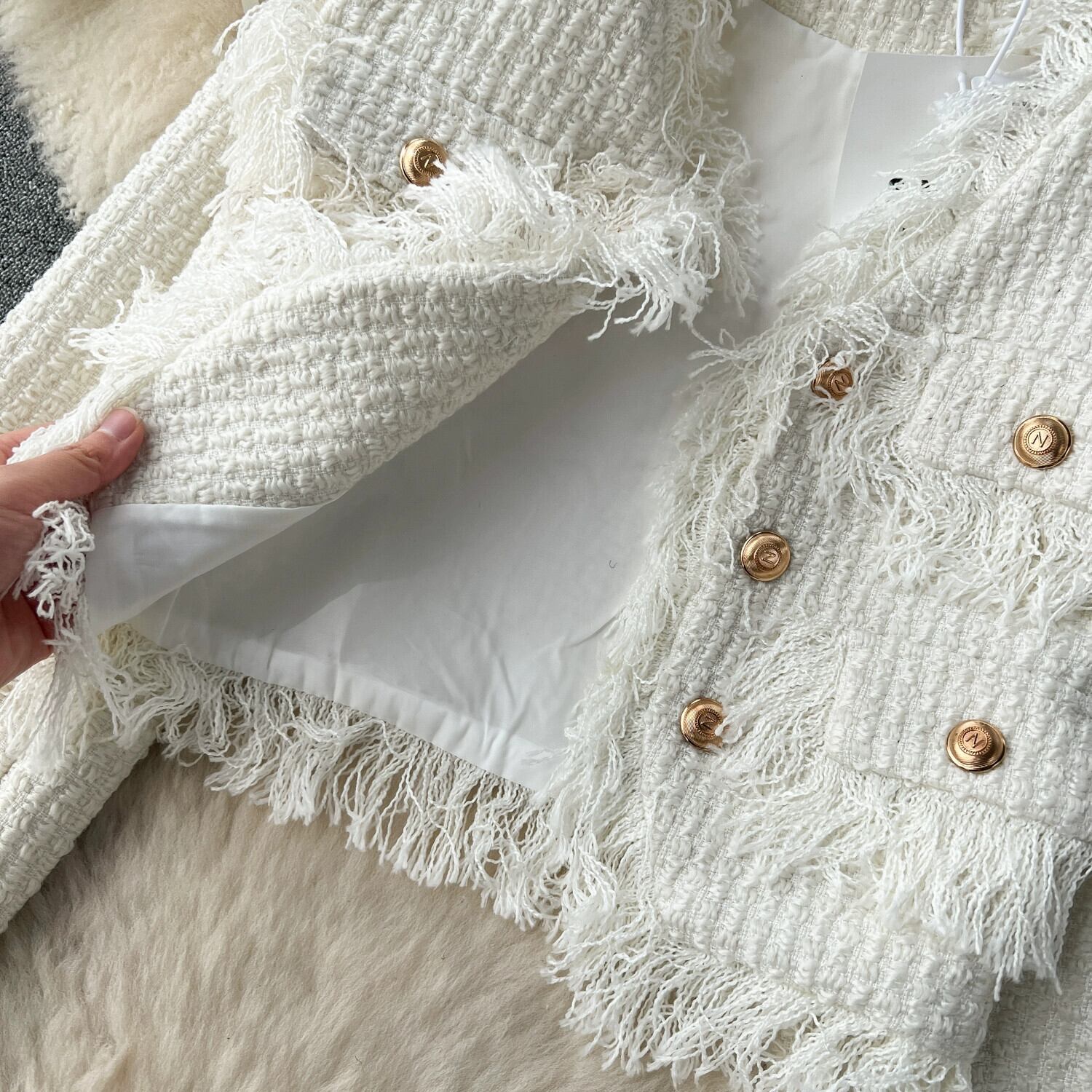 秋の香りスタイルの衣装の女性、短いフリンジ付きカーディガン ブレザー + ハイウエスト痩身ヒップ スカート ショート オータム 秋物 lyxaj51765489676
