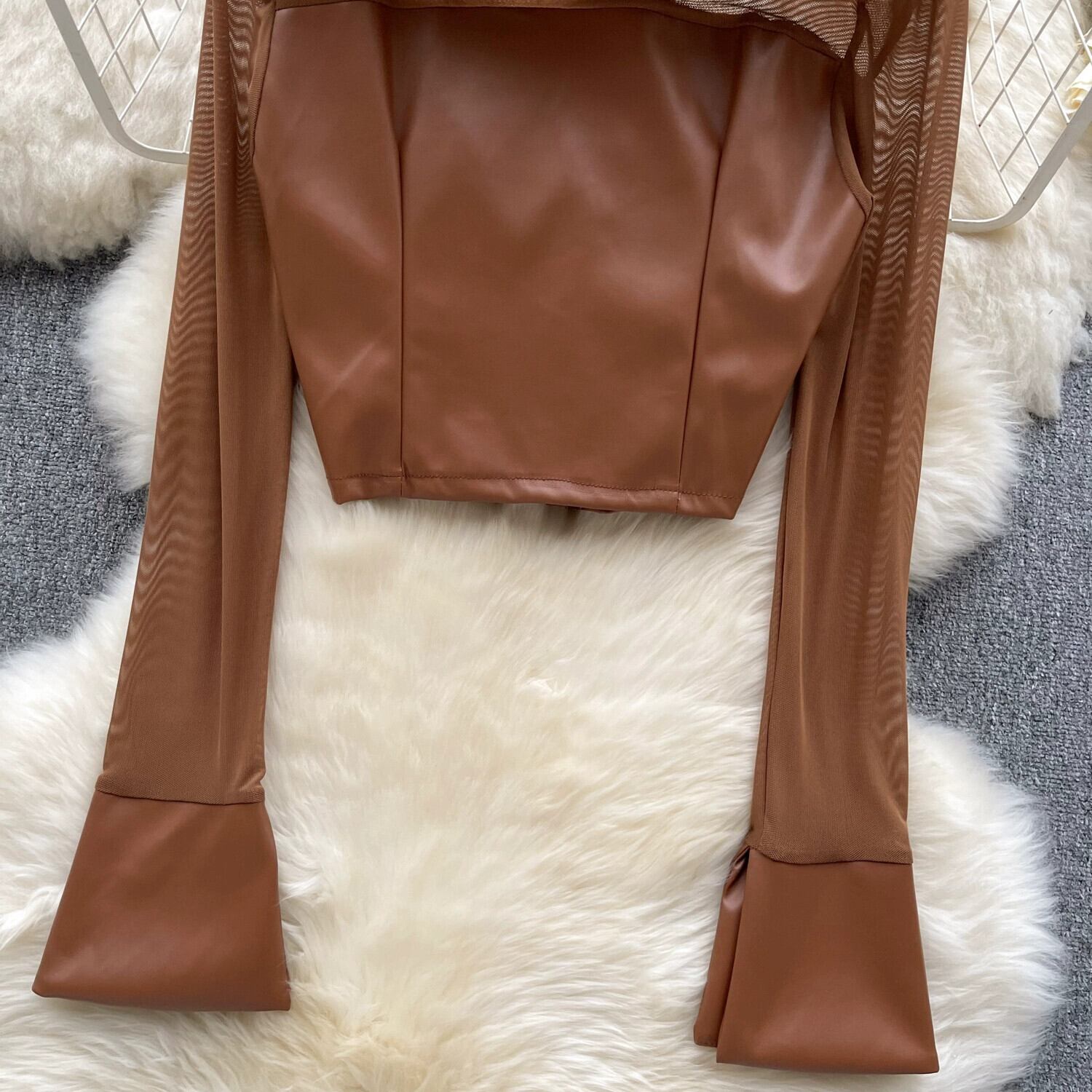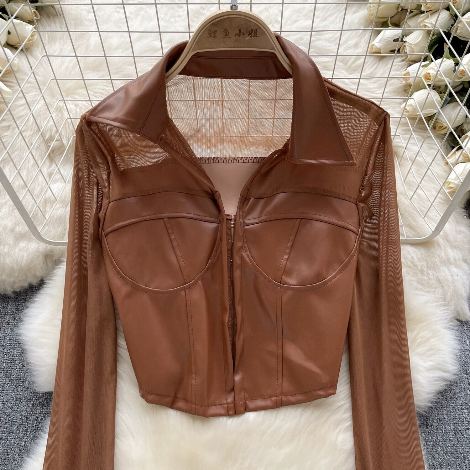 レトロ反抗的なオートバイスタイルメッシュスプライシング PU レザー Tシャツ女性の秋のタイトなショートデザイン純粋な欲望トップ オータム 秋物 ピュア lyxaj63552941901