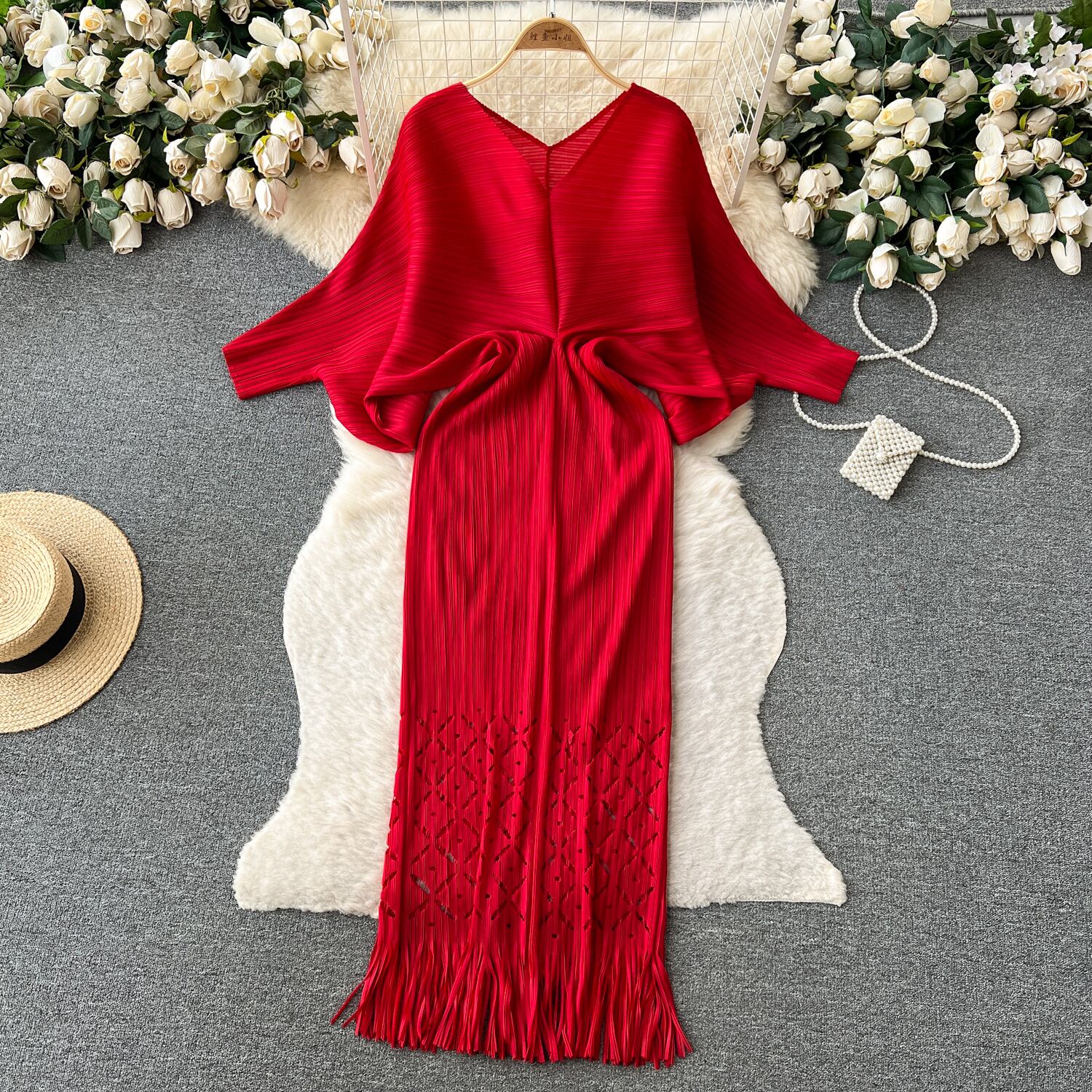 ヨーロッパとアメリカのスタイルのハイエンドの気質ルーズバットスリーブ V ネックドレス女性のウエスト痩身プリーツテルロングスカート Vネック ヨーロピアン lyxaj55944768798