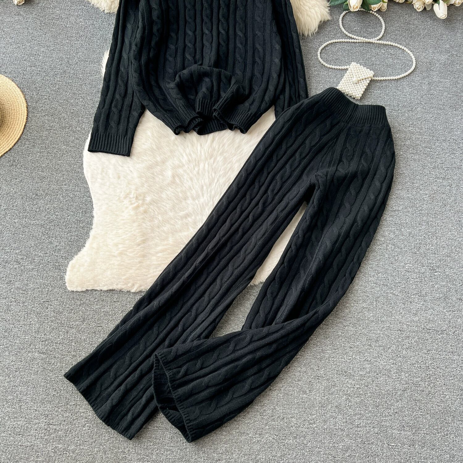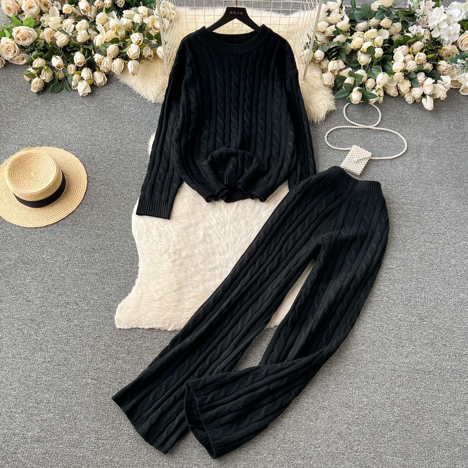 秋と冬の怠惰なスタイルのツイストスーツの女性のルーズプルオーバーラウンドネックセーターハイウエストスリムセーターパンツツーピースセット ハイウェスト オータム 秋物 ウィンター 冬物 Oネック lyxaj9780214683
