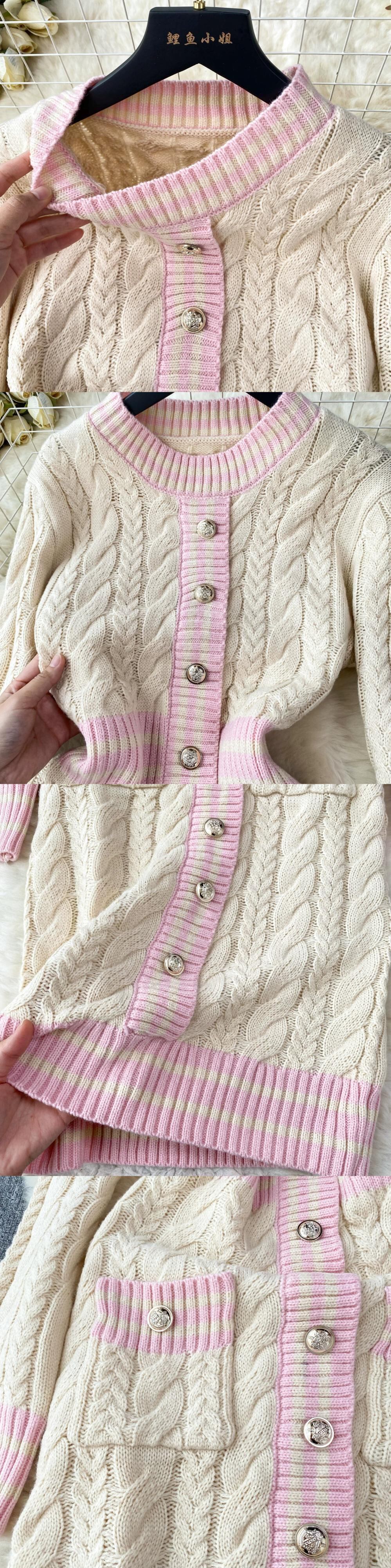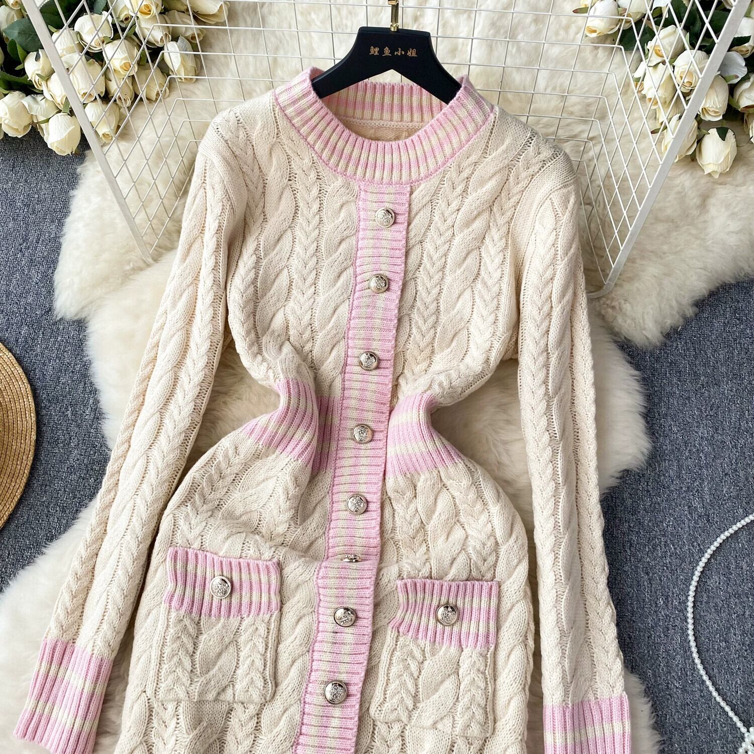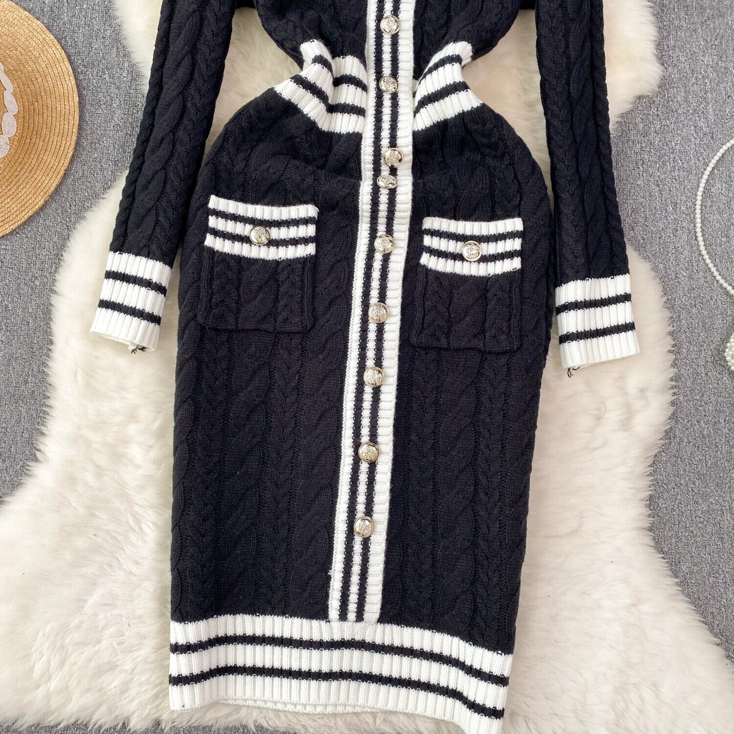 ニットドレスの女性、秋のデザイン、コントラストのあるストライプ、ウエストを細くする、長袖のボトムスカート、レトロなツイストスカート ロング オータム 秋物 lyxaj50066094482