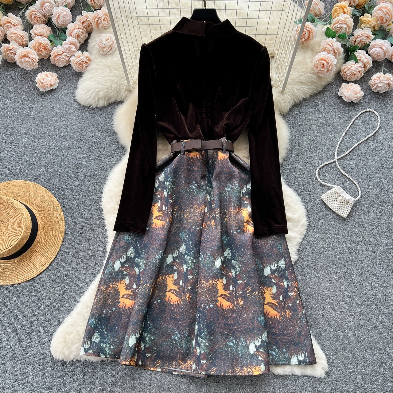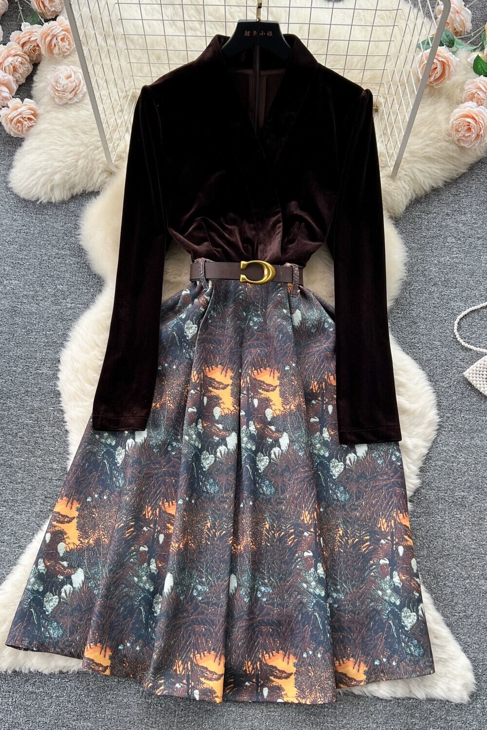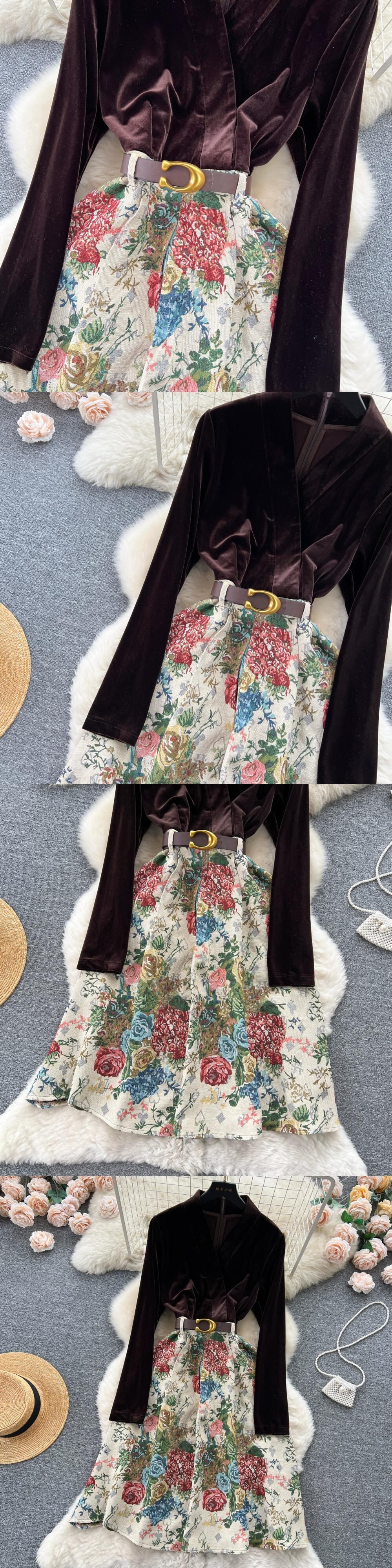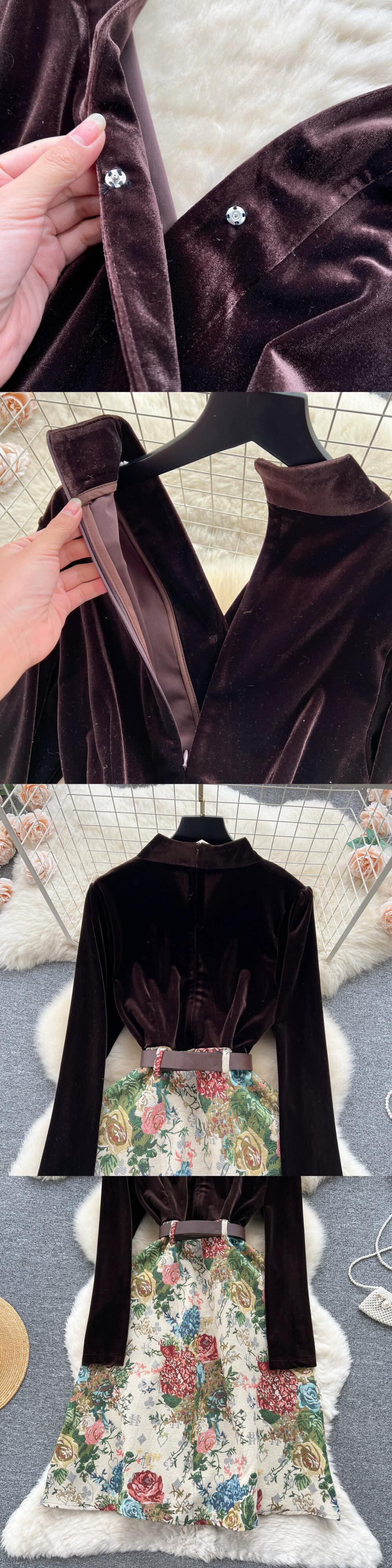 レトロなベルベットのドレスの女性の秋と冬の新しい気質 V ネックデザイン偽ツーピーススプライシングジャカードドレススカート オータム 秋物 ウィンター 冬物 Vネック lyxaj38384037480