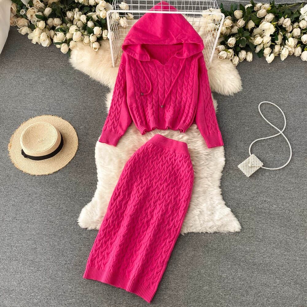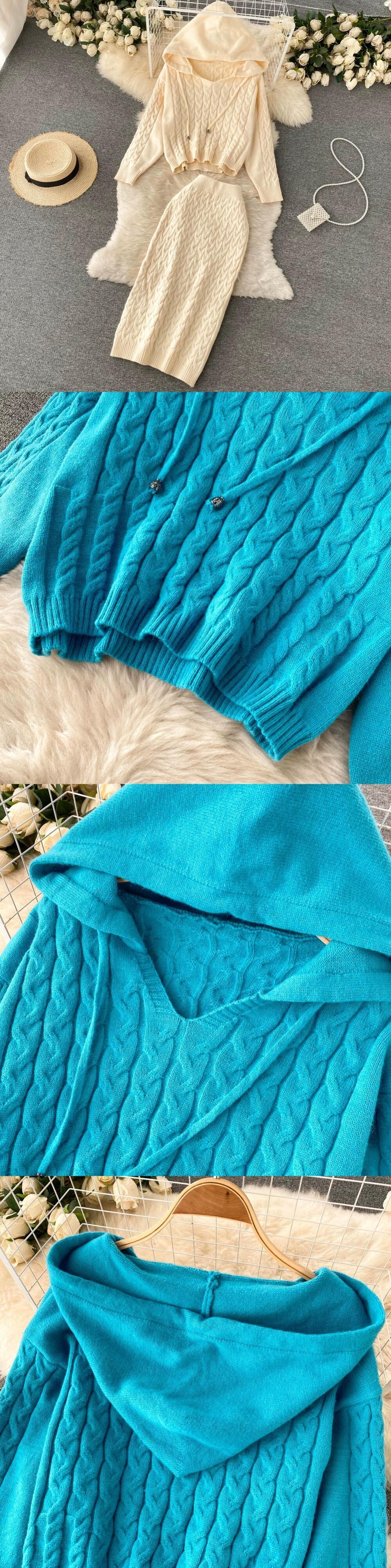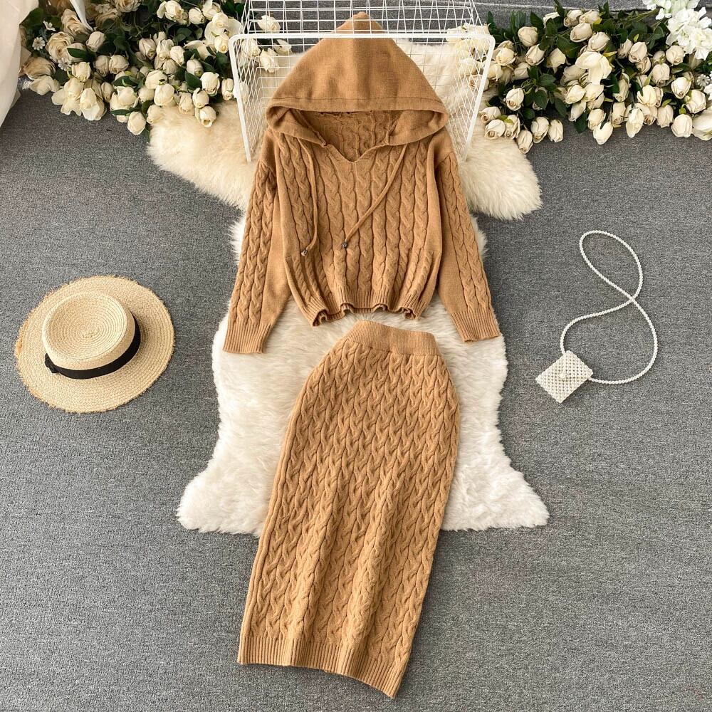 香港スタイルのレトロなフード付き V ネックショートプルオーバーツイストニットセーター女性ハイウエストとヒップスカートツーピーススーツ ハイウェスト Vネック lyxaj6266080152