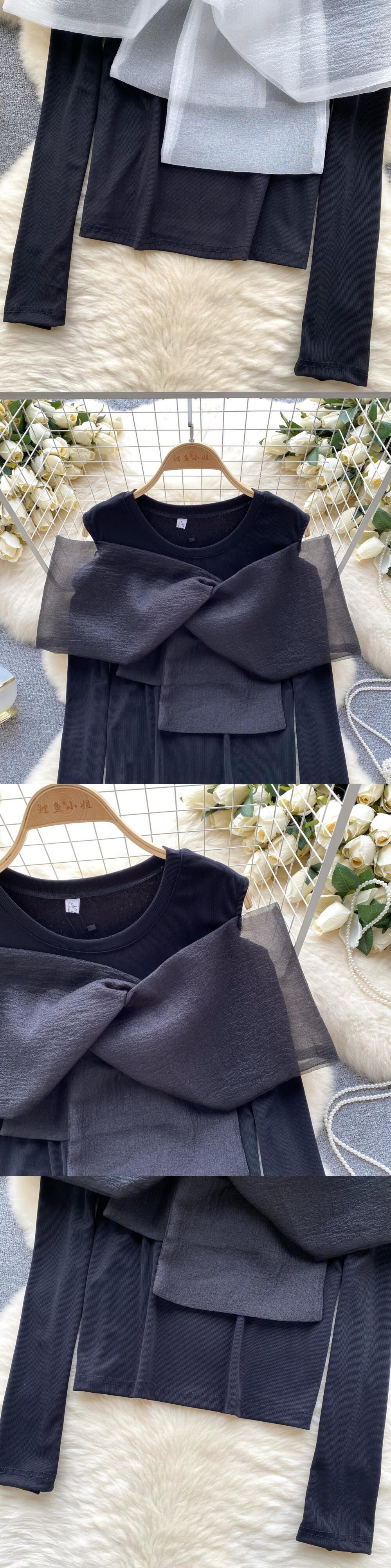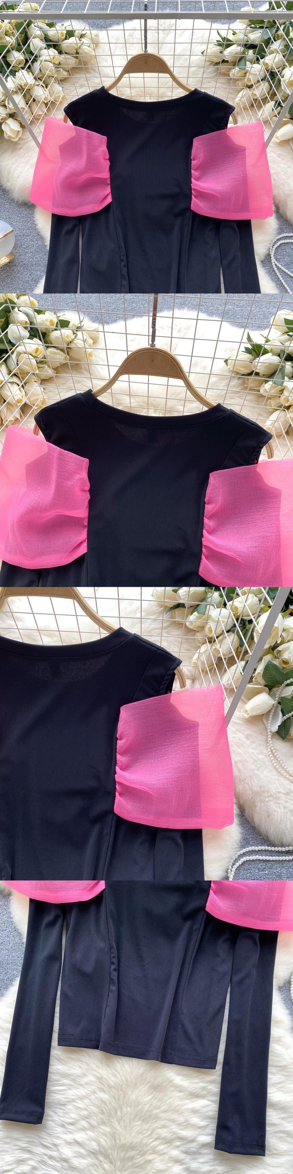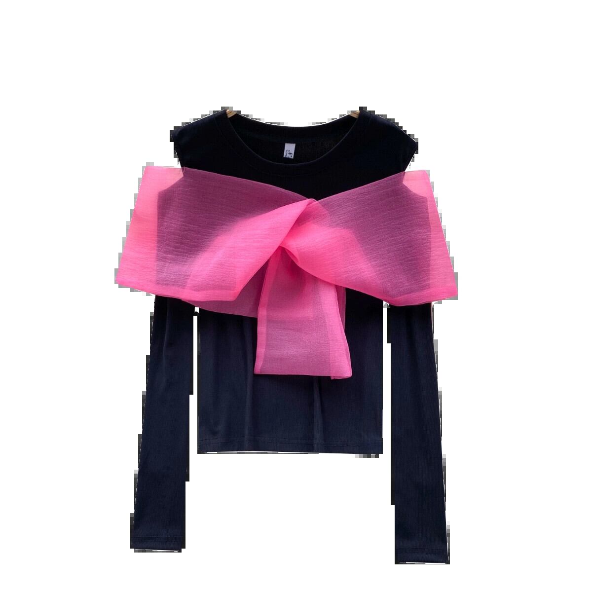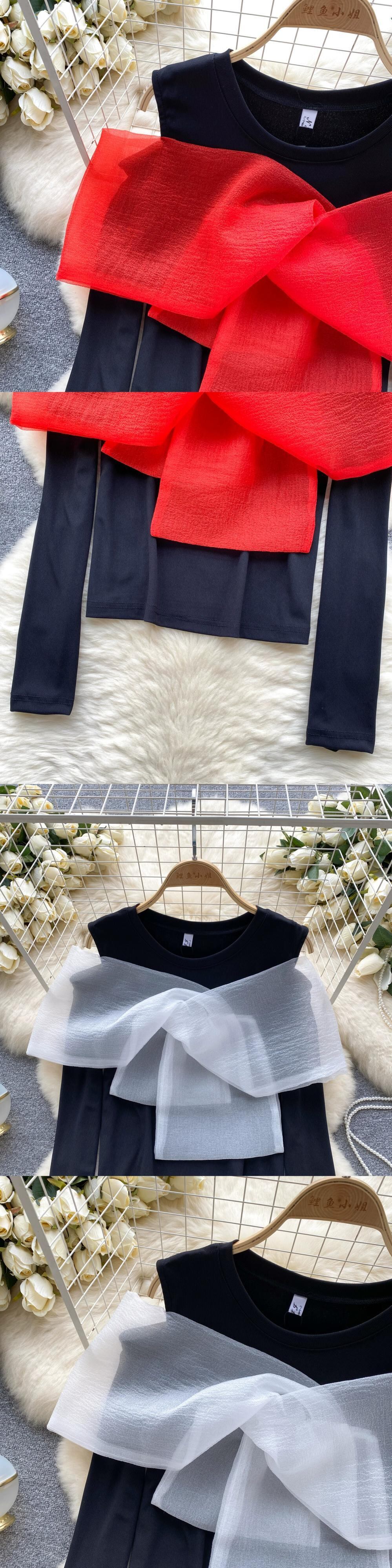 トップス女性 2023 秋の新しいニッチコントラストカラー弓計画オフショルダー長袖 Tシャツ女性 ロング リボン オータム 秋物 lyxaj74741680899