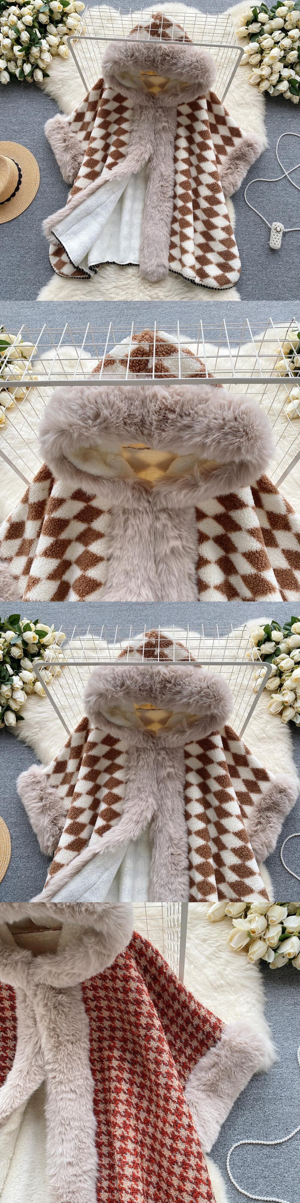 インターネットセレブケープコート女性 2023 新しい人気の冬のフード付きチェック柄ミッドレングスベルベット厚みのあるショールコート ウィンター 冬物 lyxaj19735997289
