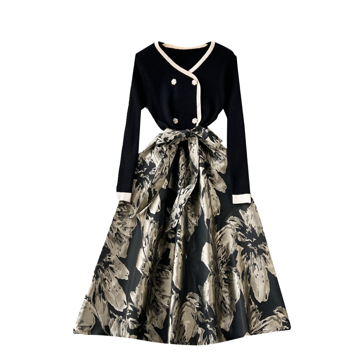 秋と冬の小さな香りのスタイルのドレスの女性、ハイエンドのウエストライン、痩身気質、レトロなニットスプライシングジャカードロングスカート オータム 秋物 ウィンター 冬物 lyxaj77091788451