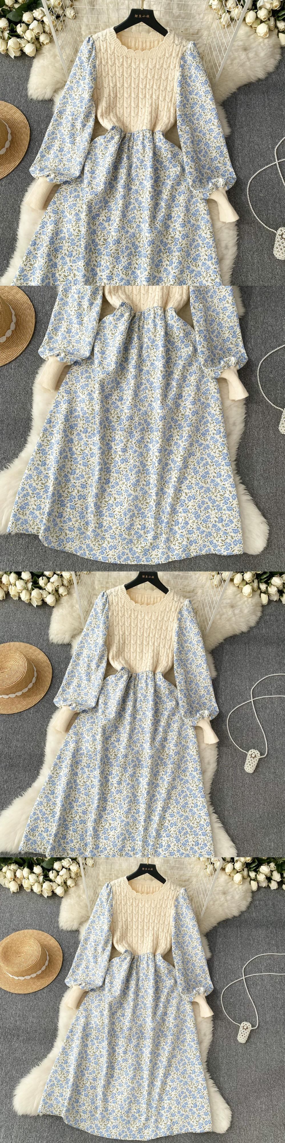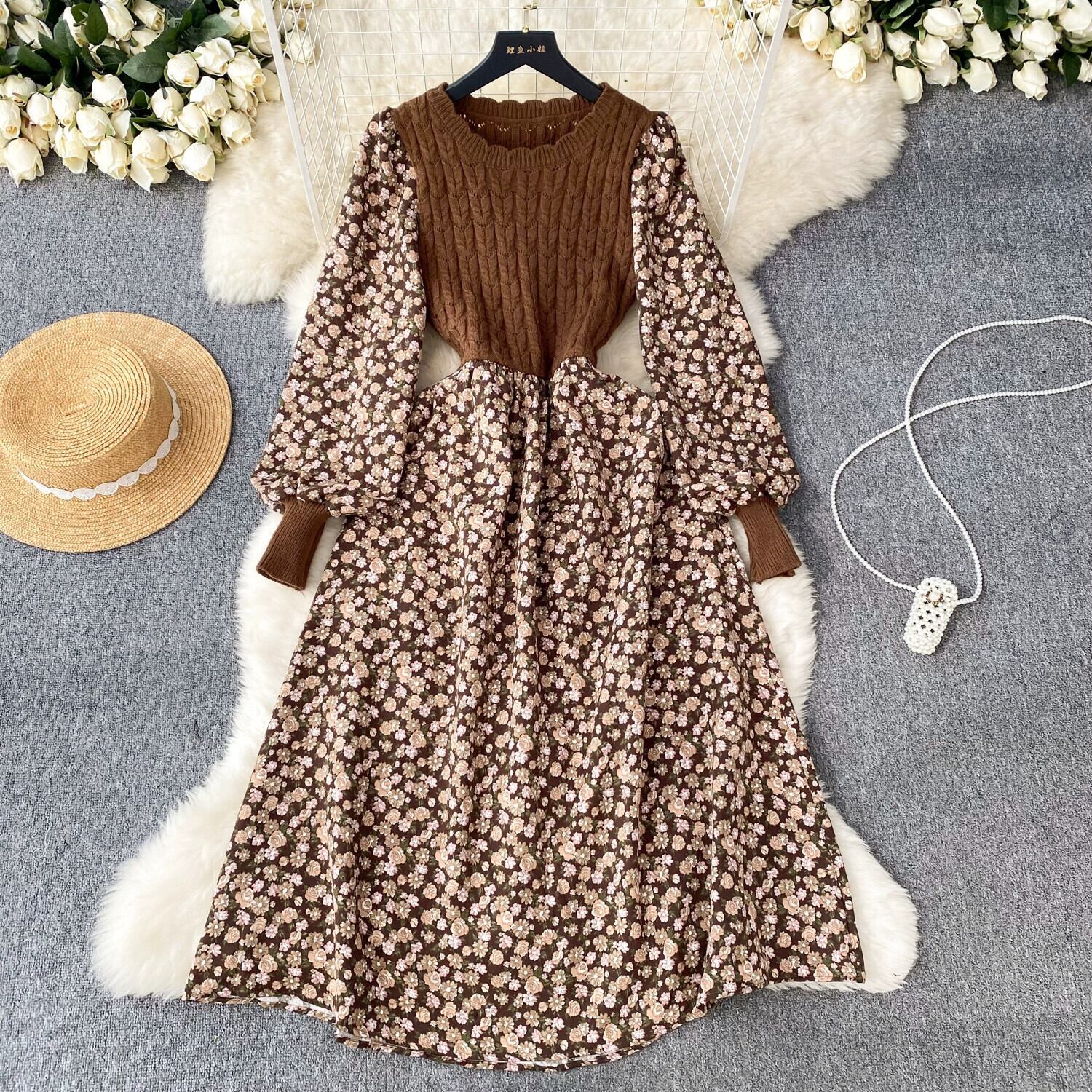 秋冬のニットパッチワーク花柄コーデュロイドレス女性、スリムでハイエンドのウエストを締めるフェイクツーピースセータードレス ウィンター 冬物 lyxaj18159178336