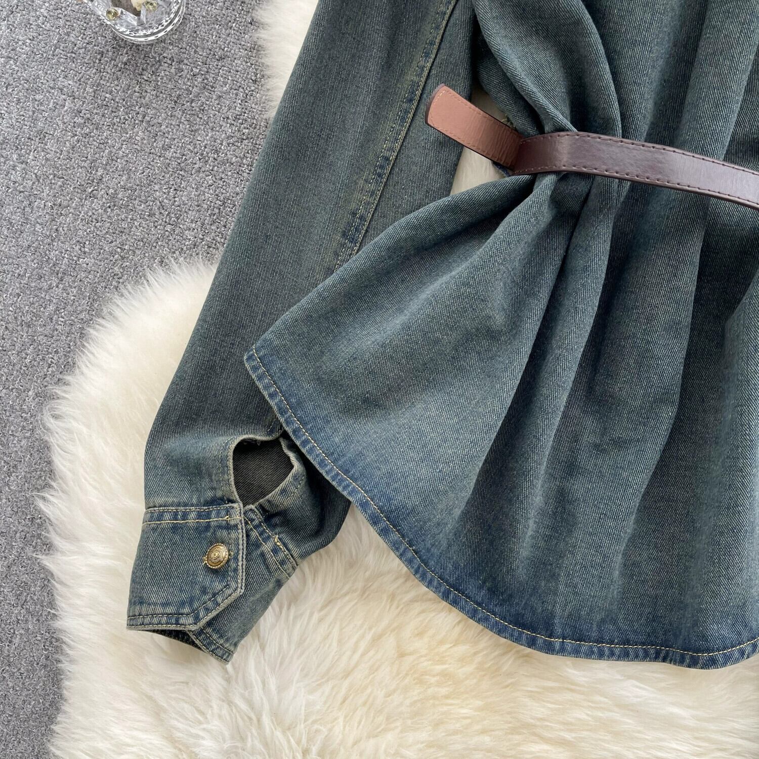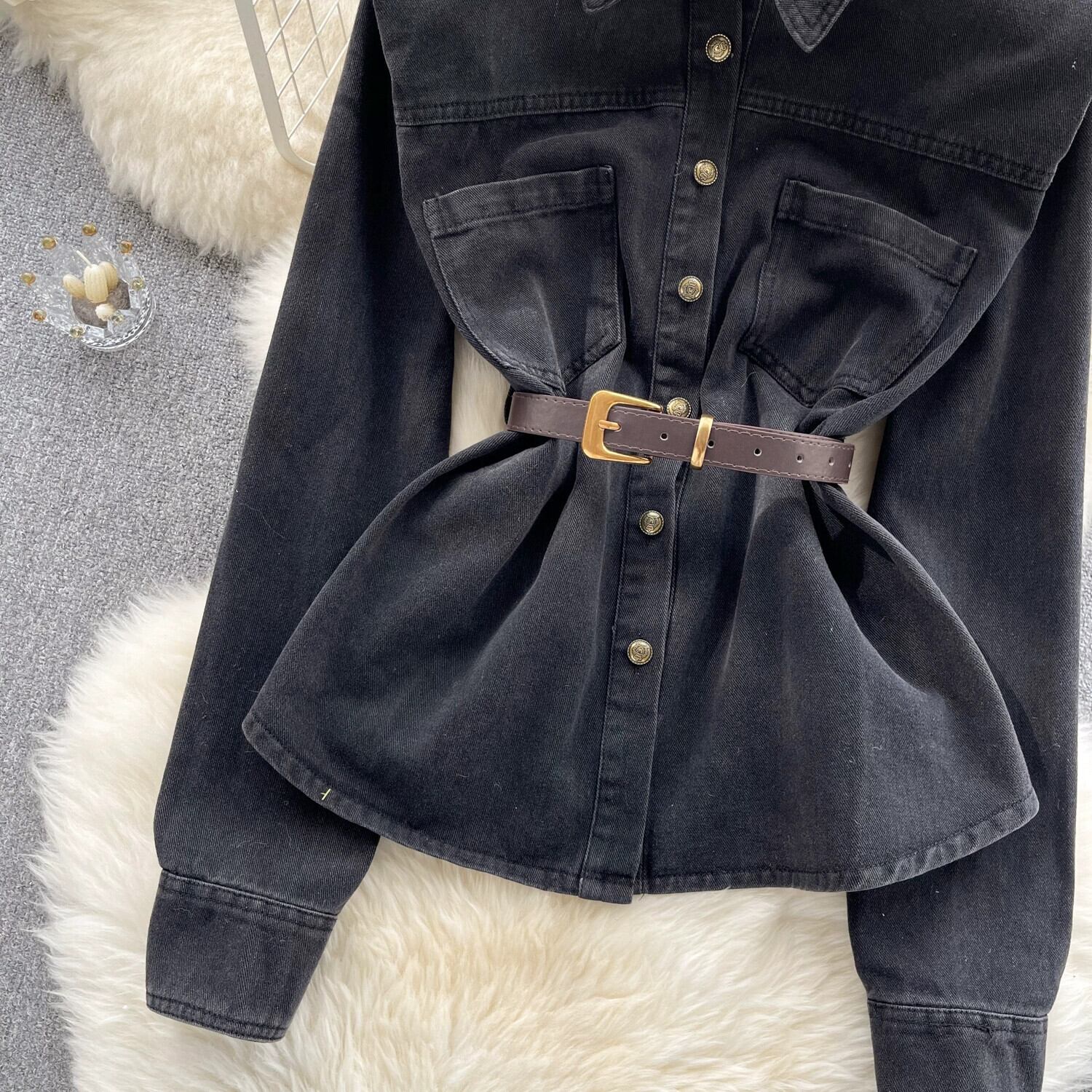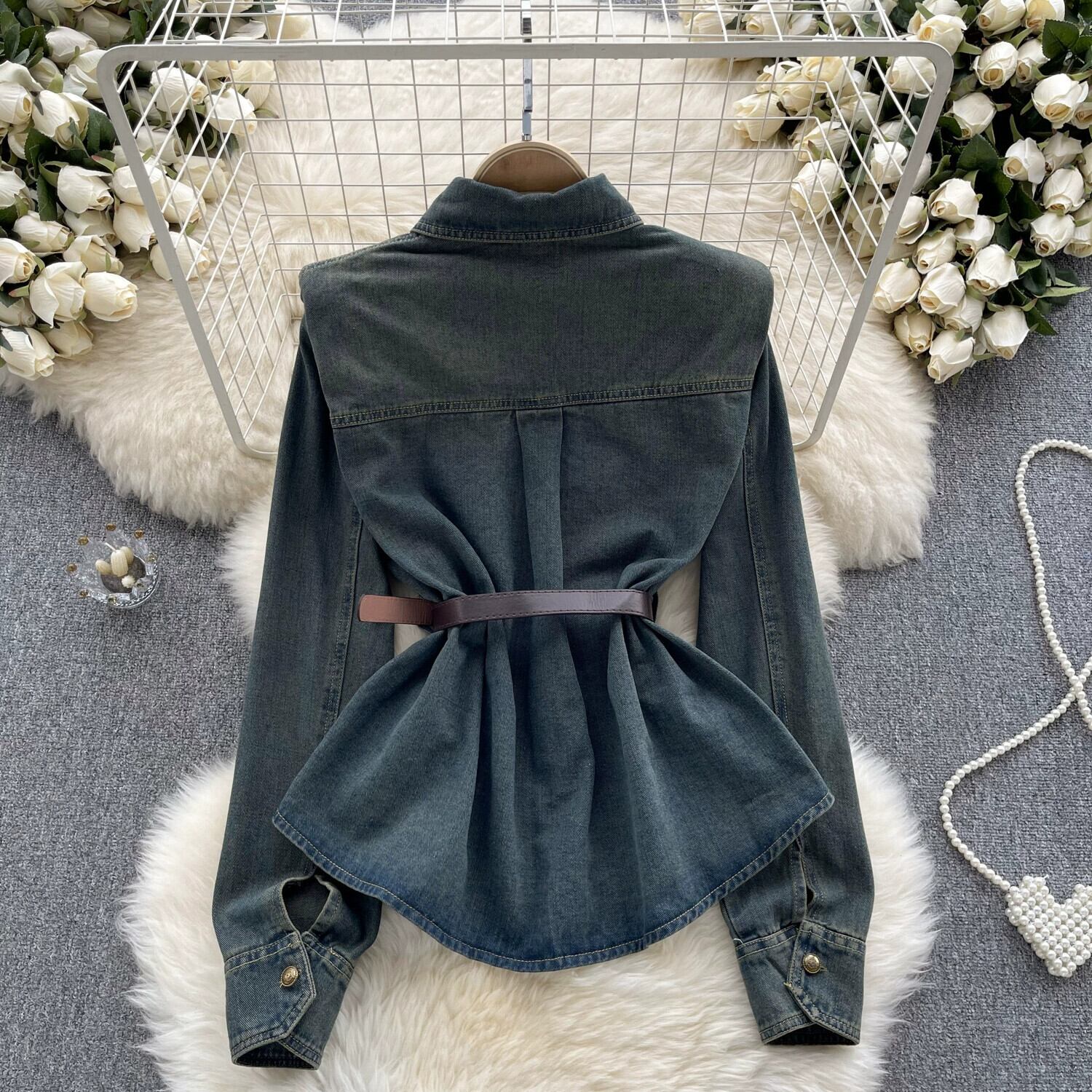 ヨーロッパとアメリカのスタイルのレトロなダメージ加工のハイエンドデニムシャツの女性の秋のウエスト痩身ストリートデザインニッチトップストレンディ オータム 秋物 ヨーロピアン lyxaj15977478755