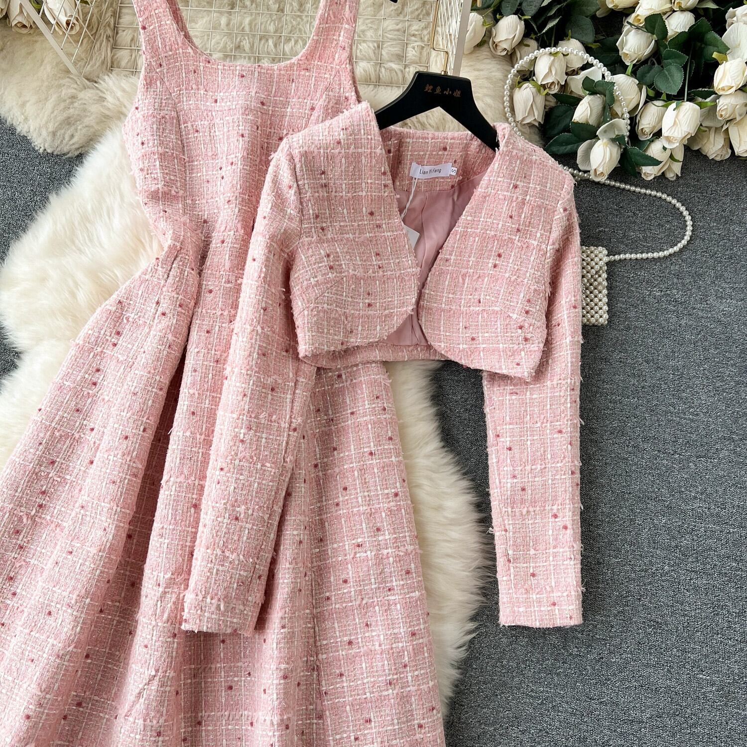 秋冬レディライクショートツイードブレザーレディースインナーウエストベストサスペンダードレス2点セット オータム 秋物 ウィンター 冬物 lyxaj91224571372