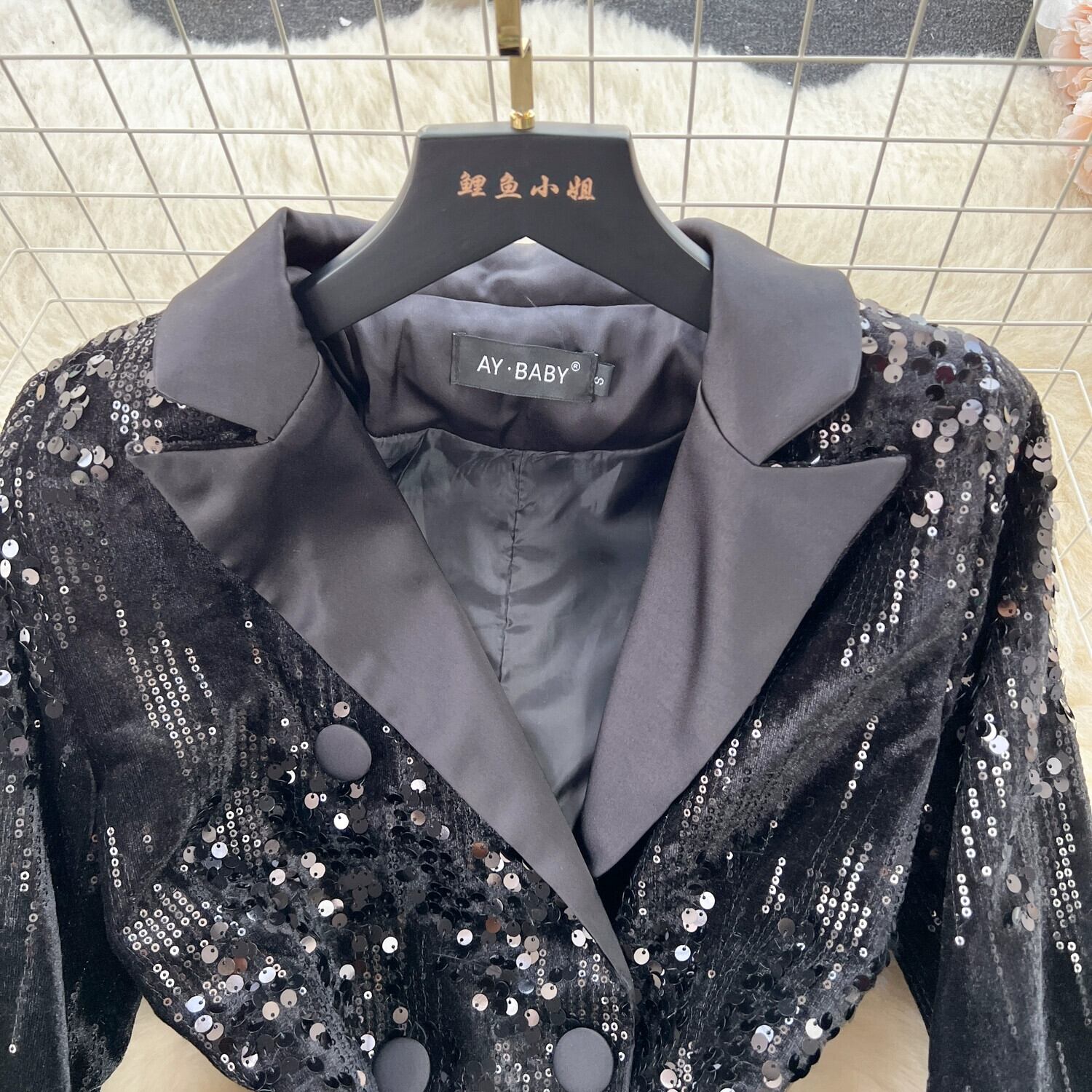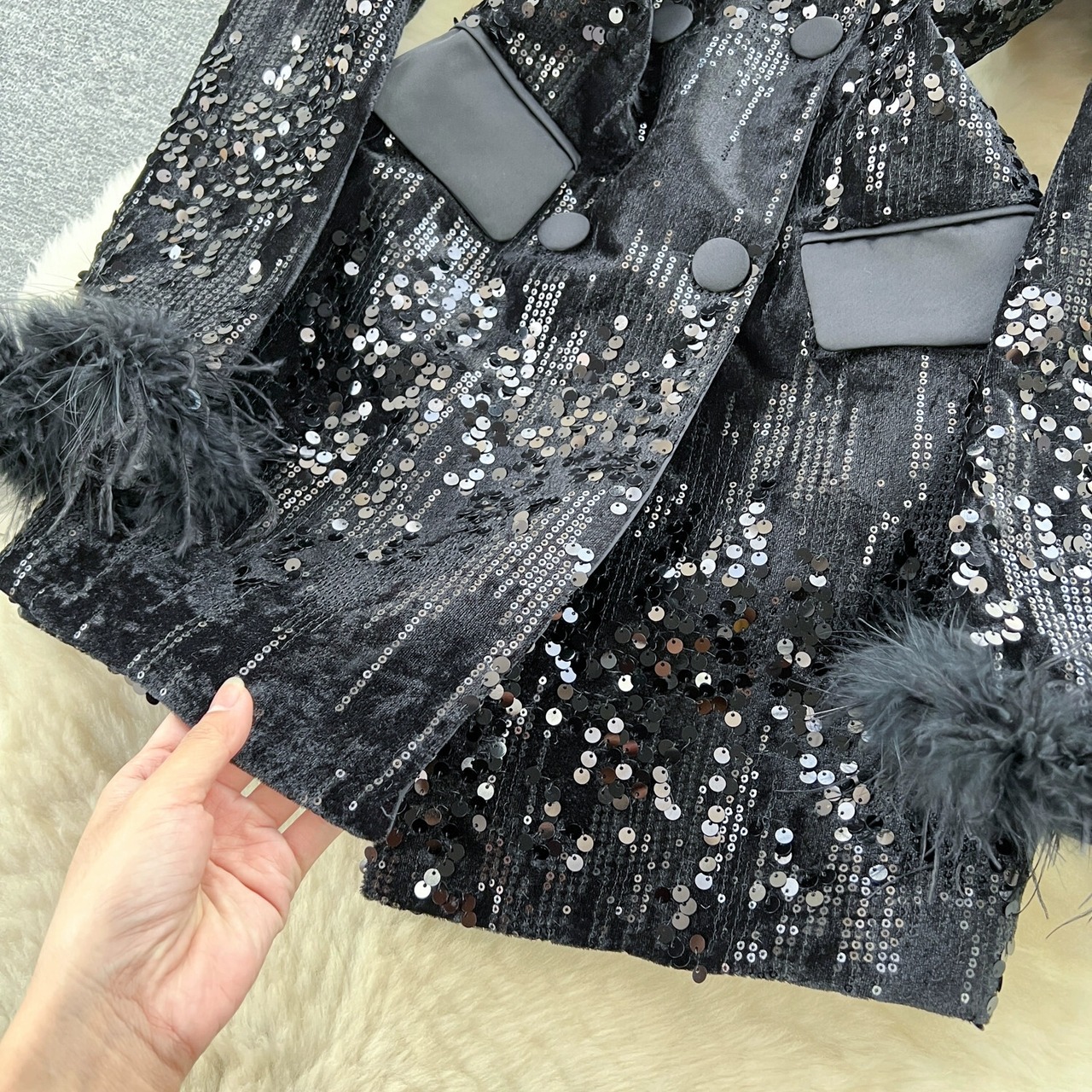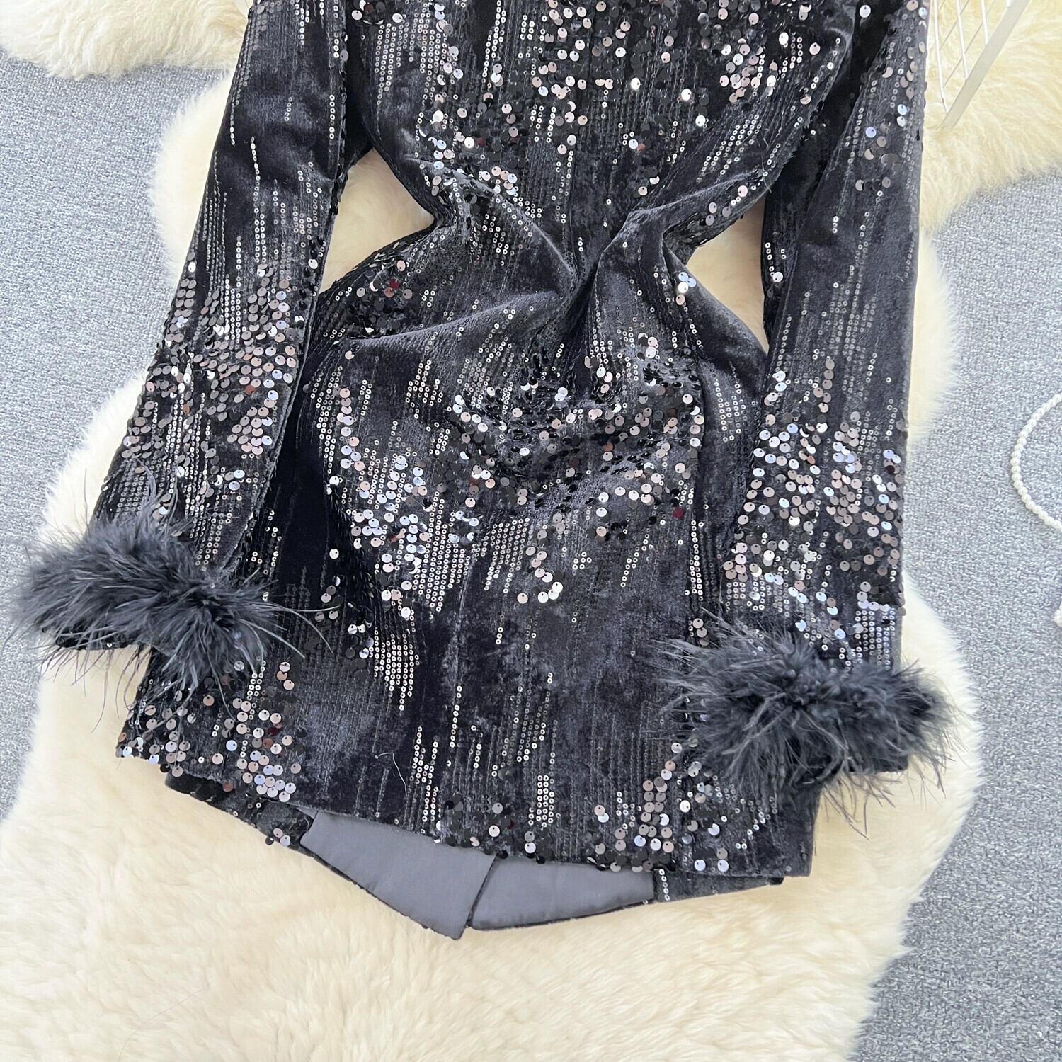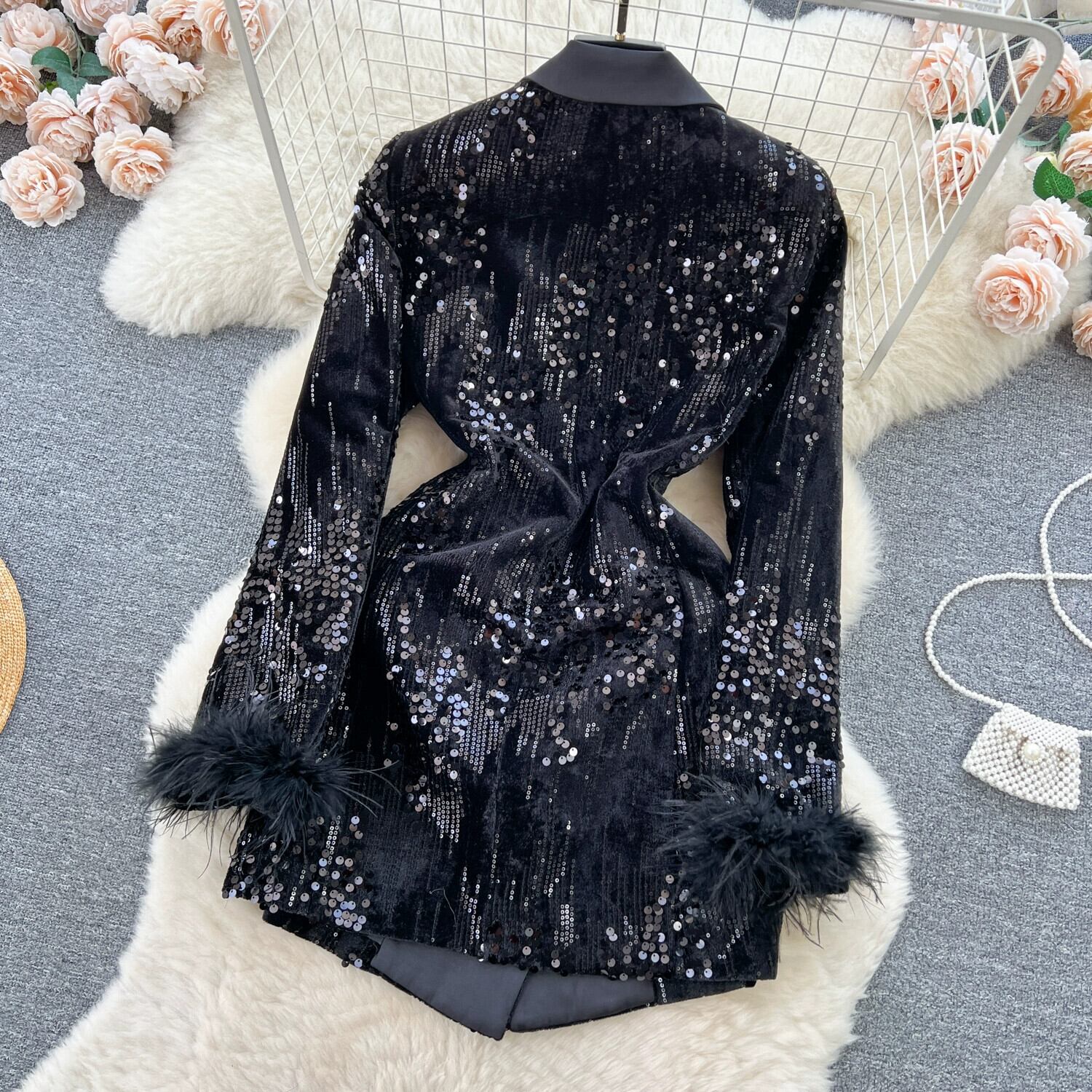 ライト高級クイーンスーツドレス女性のファッショナブルなポケットダブルブレスト毛皮のような袖スリミングハイエンドスパンコールスカート lyxaj15938448533