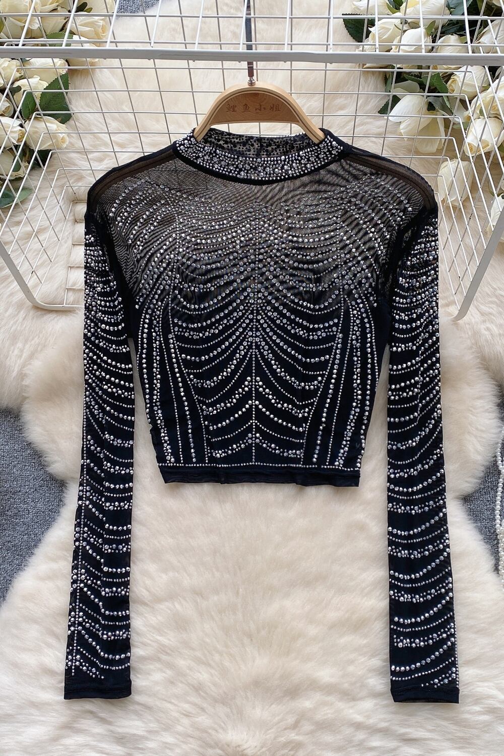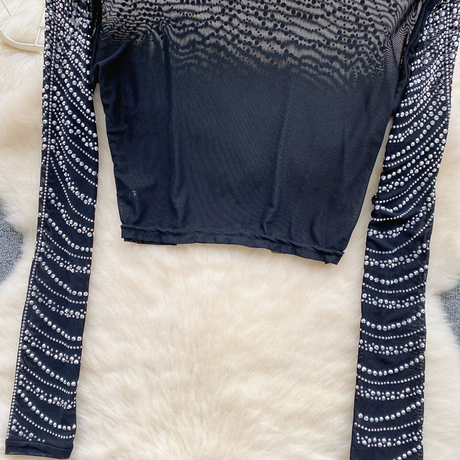 ヨーロッパとアメリカの軽い高級セレブスタイルのハイエンド長袖Tシャツの女性の秋と冬のダイヤモンドメッシュデザインの気質トレンディなトップ ロング オータム 秋物 ウィンター 冬物 ヨーロピアン lyxaj27010204955