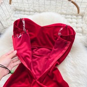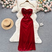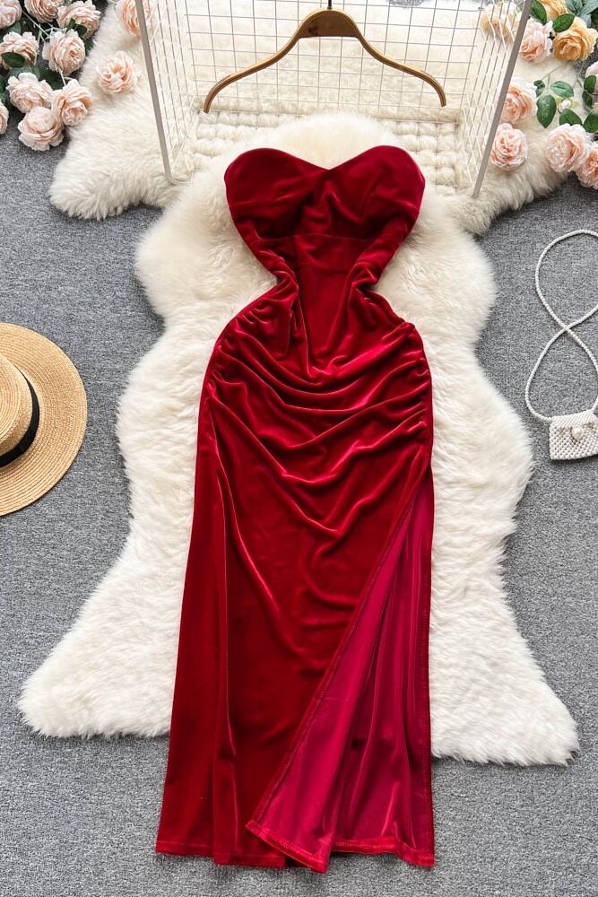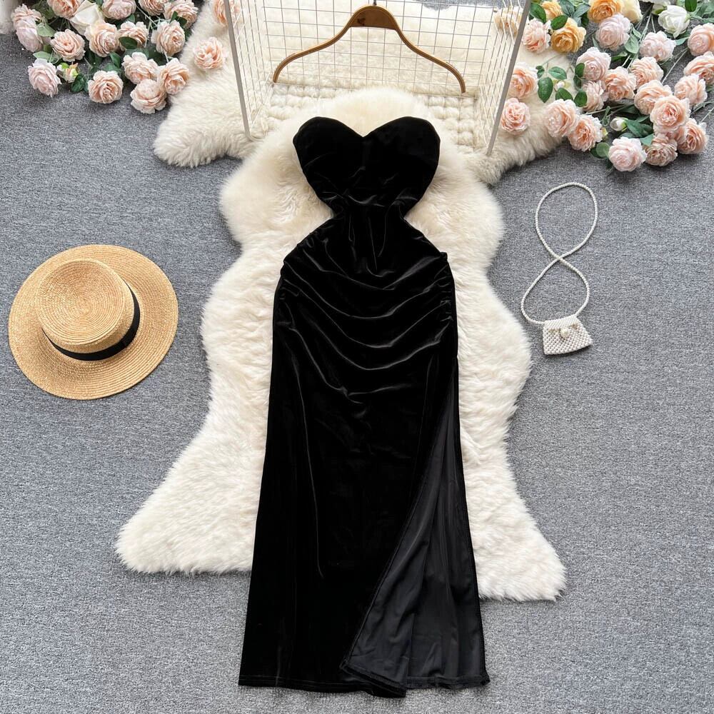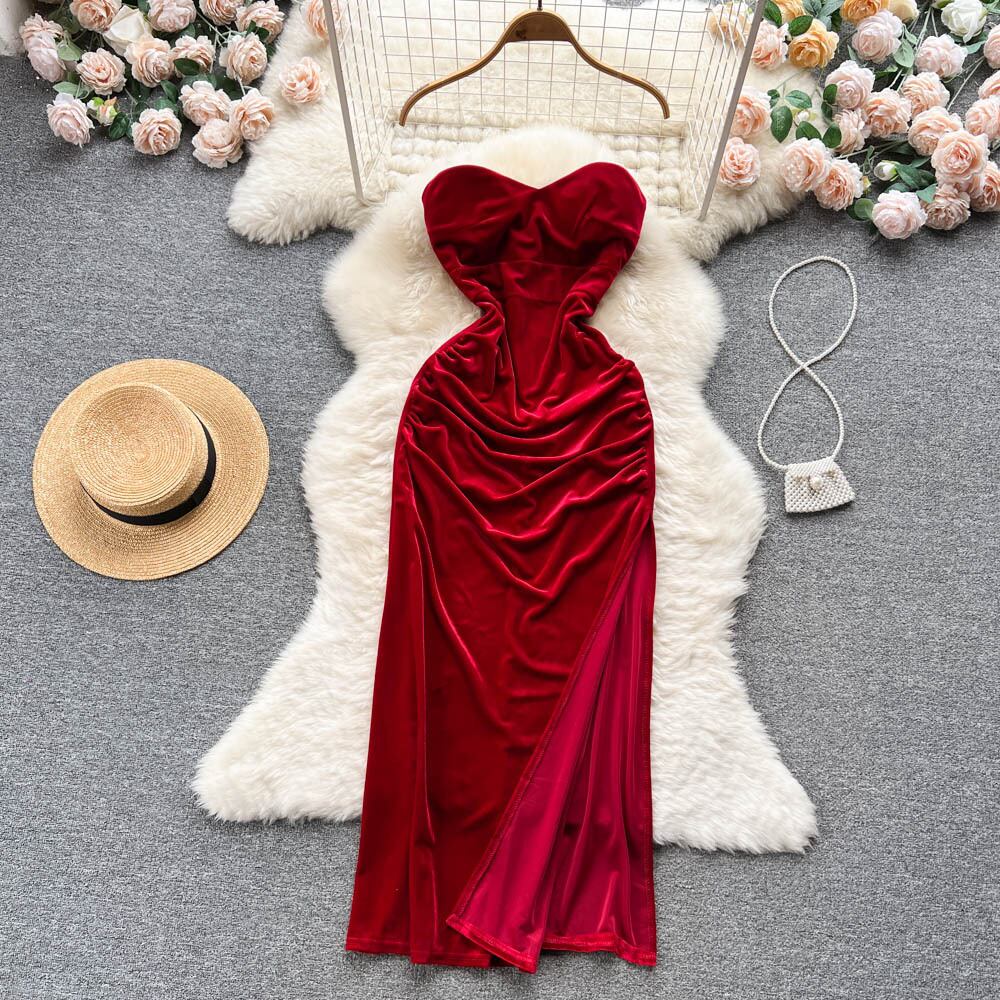 2022 新しい秋と冬のセクシーな淑女のような気質チューブトップドレス女性のスリムスリットイブニングドレスベルベットロングスカート オータム 秋物 ウィンター 冬物 lyxaj18106056879