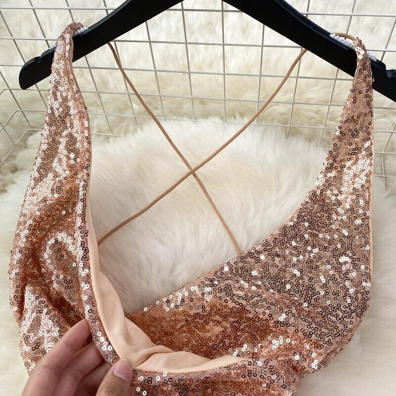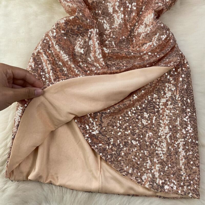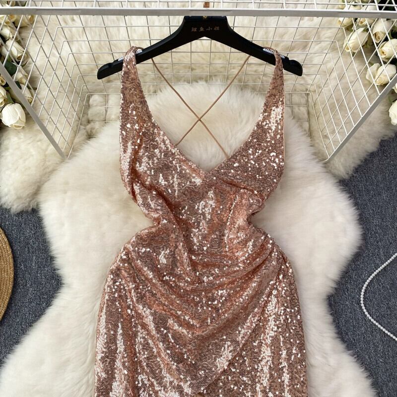 ゴールドのセクシーなスパンコールディープ V ネックサスペンダードレスの女性、光沢のあるドレス、ライトラグジュアリー、ニッチ、ハイエンドのヒップハグスカート Vネック lyxaj75742132399