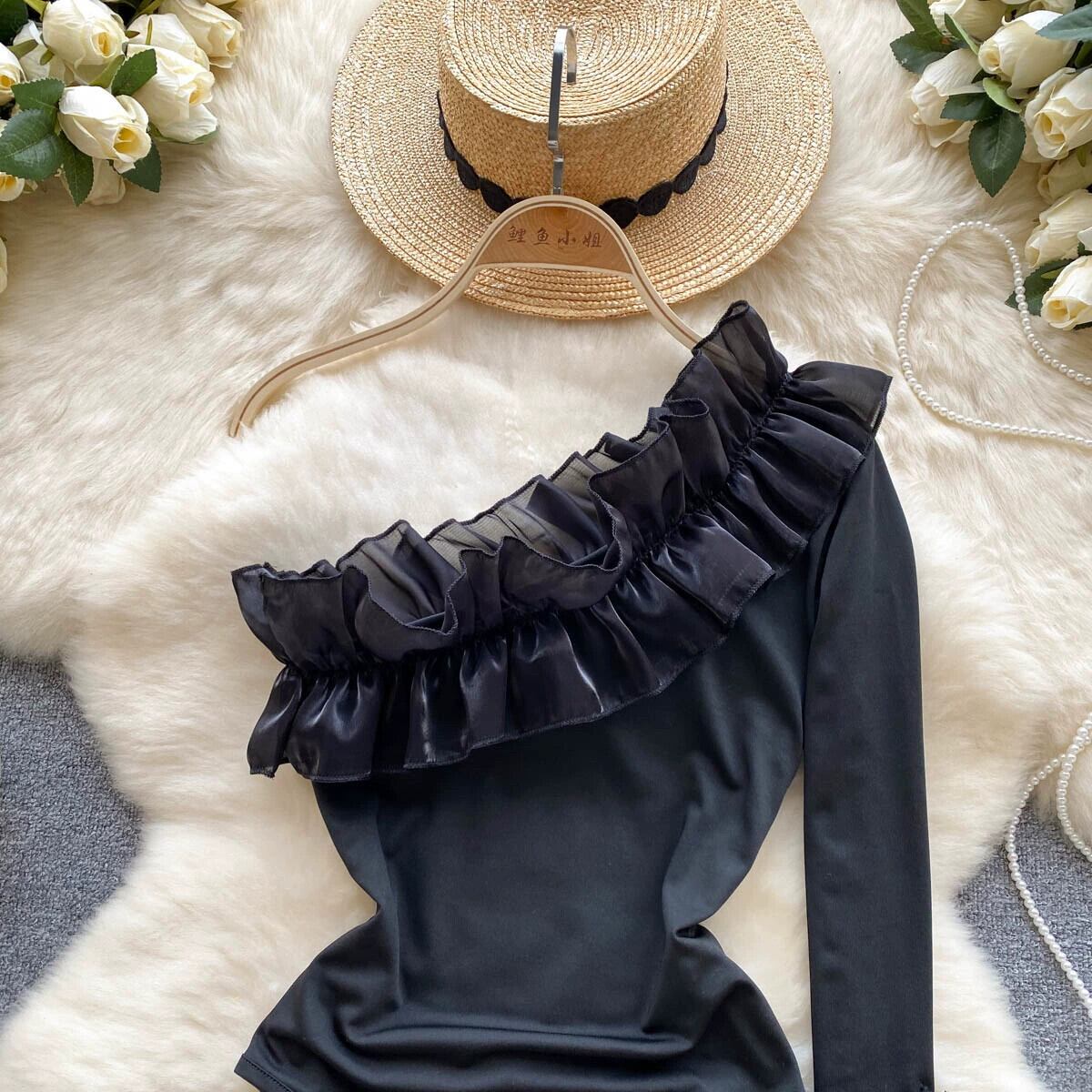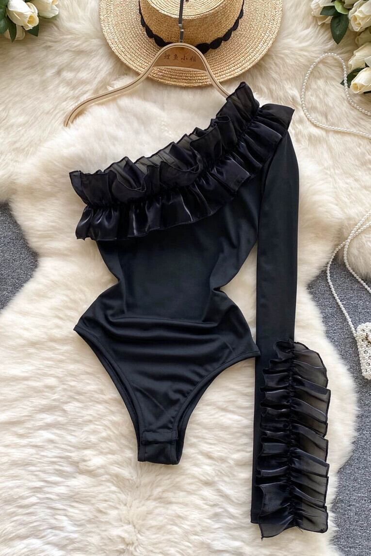 ヨーロッパとアメリカのトップデザインのニッチな女性のプリーツフリル傾斜襟オフショルダーワンショルダー長袖ジャンプスーツ女性多用途でトレンディな ロング ヨーロピアン lyxaj56478908611