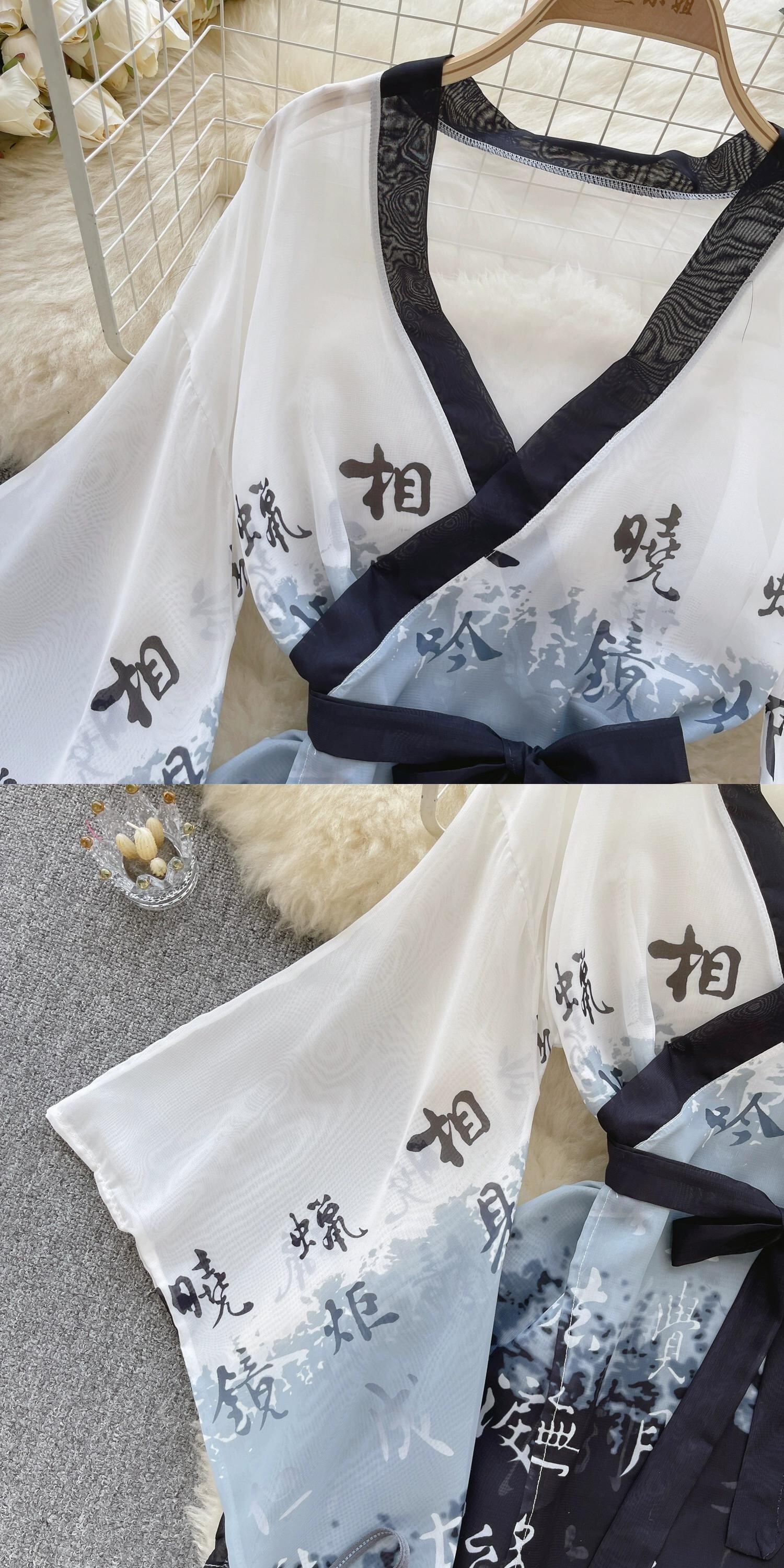 レトロ中国風プリントメッシュドレス女性の夏のストラップウエスト V ネック純粋な欲望ホットガールスーツ サマー 夏物 Vネック ピュア lyxaj99248054212