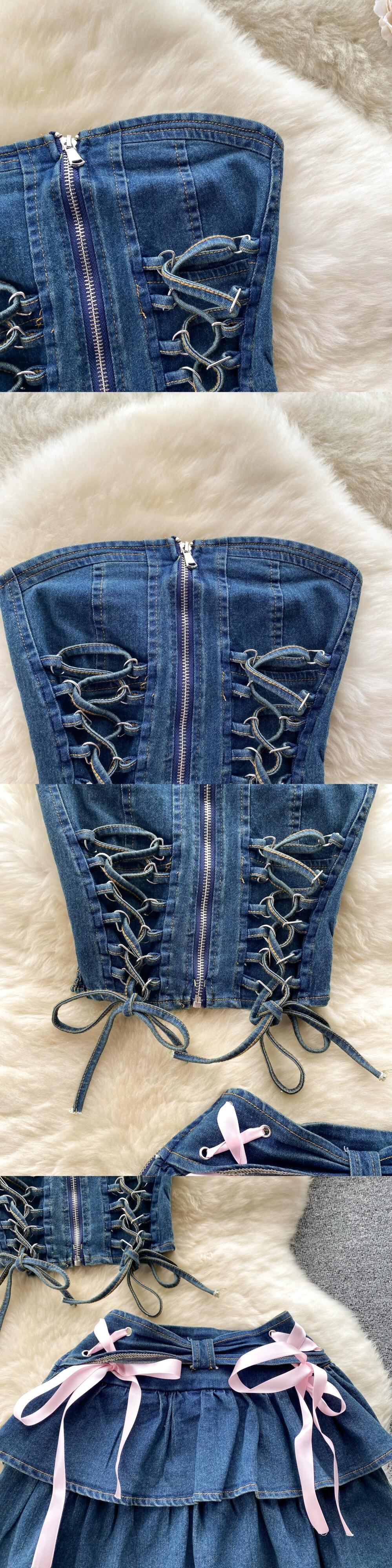 純粋な欲望セクシーなホットガールデニムスーツフレンチストラップノースリーブチューブトップウエストAラインケーキスカート lyxaj37349826439