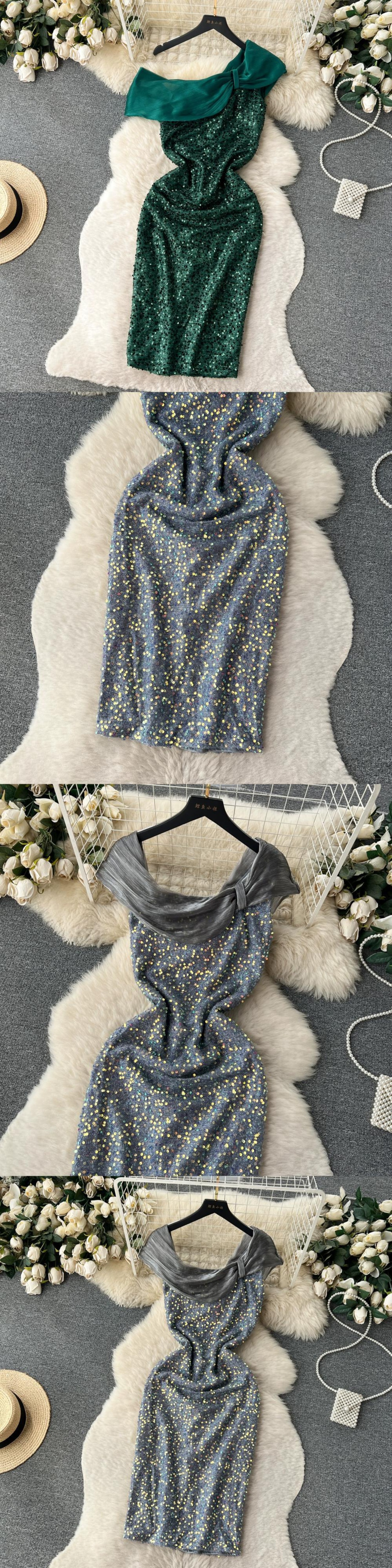 リッチスタイルのハイエンドドレスの女性の夏のスパンコールスリットデザインニッチユニークなスリム気質スカート サマー 夏物 lyxaj61761421541