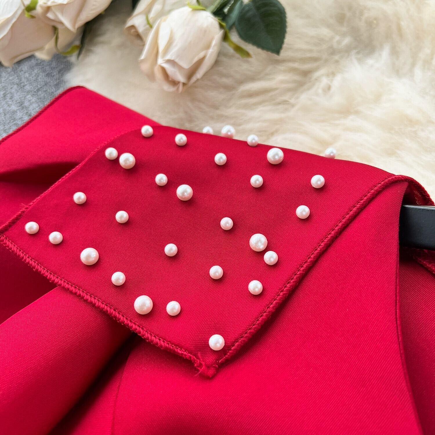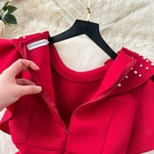 ライトラグジュアリーレトロエレガントビーズラウンドネック蓮の葉スリーブドレス女性のウエスト痩身ハイエンドエレガントドレスロングドレス Oネック lyxaj42985516876
