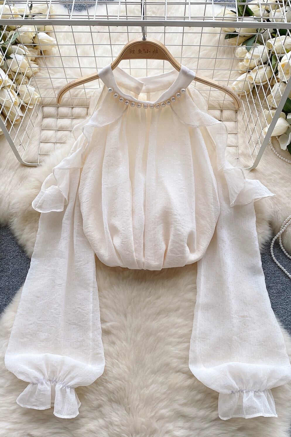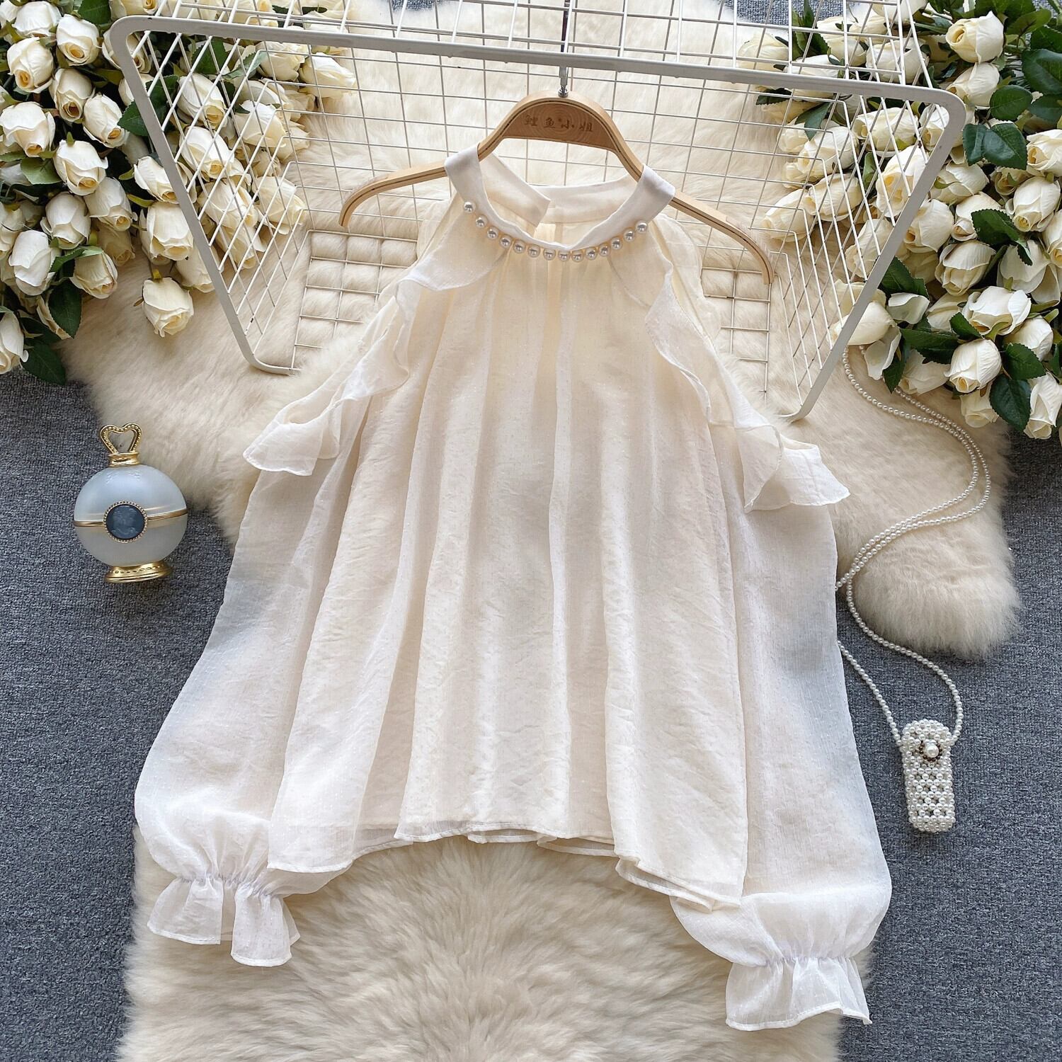 優しいスタイルのシフォントップ女性の長袖中空ショルダービーズホルターネックシャツ 2023 秋の新作服 ロング オータム 秋物 lyxaj14637379524