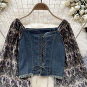 ヨーロッパとアメリカのレトロなスタイルのワンショルダーデニムシャツ女性の秋と冬のパフスリーブストラップデザインショートトップ オータム 秋物 ウィンター 冬物 ヨーロピアン lyxaj48187444680