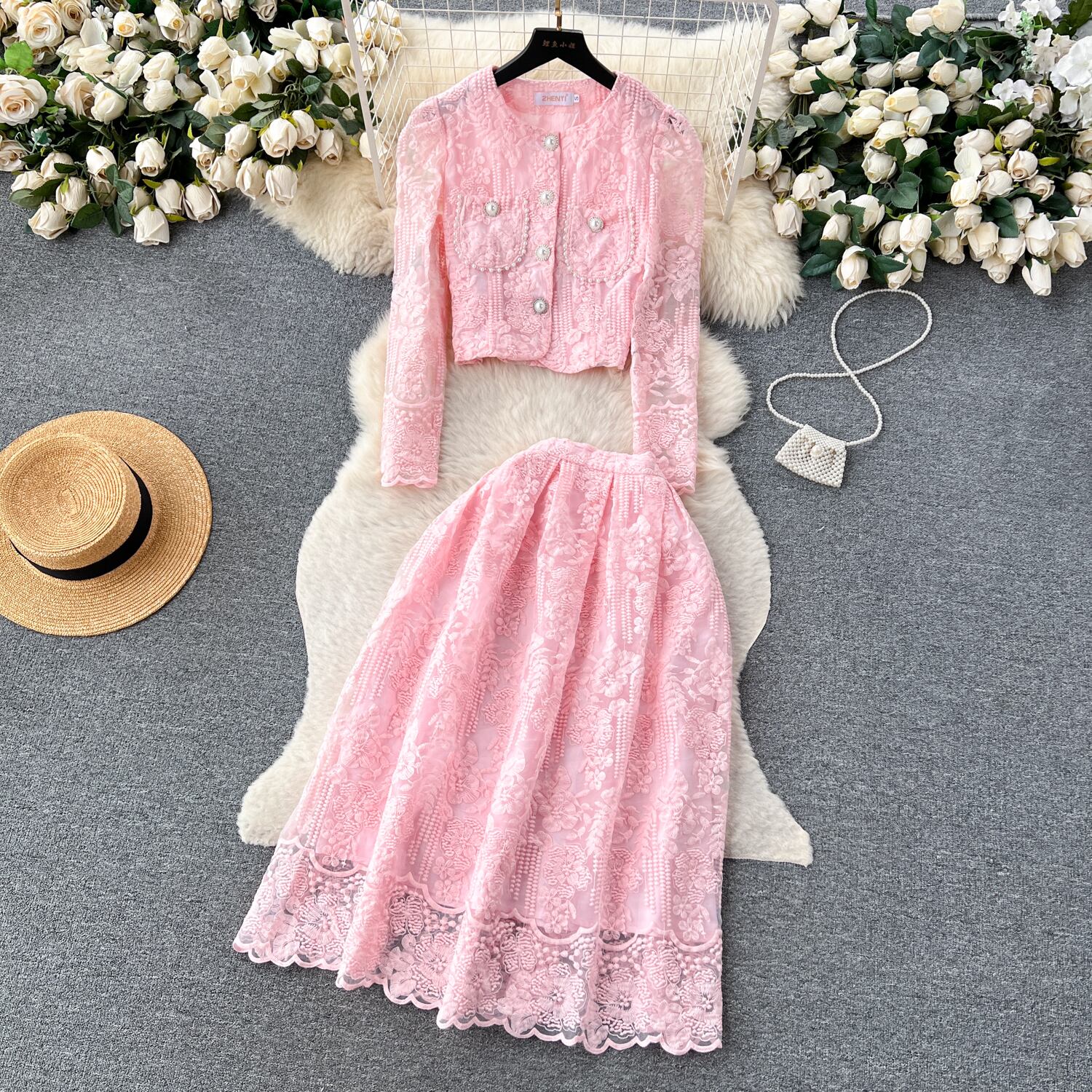 小さな香りのスタイルのスーツの女性、ショートラウンドネック、パフスリーブ、レーストップ、ハイウエスト、ワイドスカート、女性の秋のツーピースセット ハイウェスト オータム 秋物 Oネック lyxaj69239169863