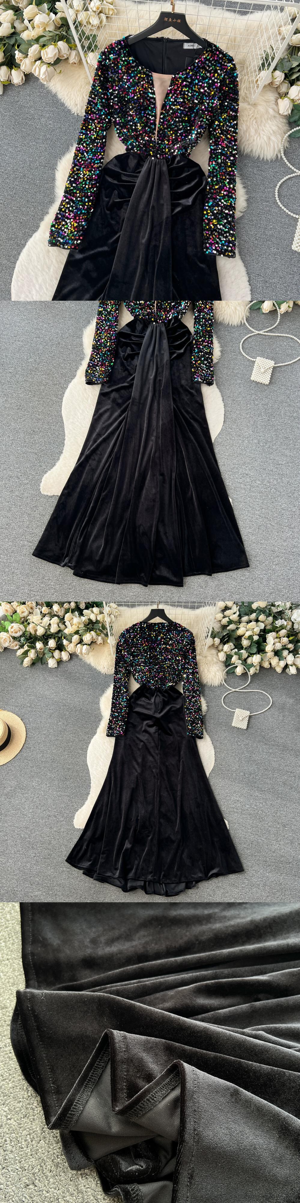 レトロベルベットドレス女性秋と冬 2023 新しい重工業カラースパンコールデザインステッチロングドレススカート オータム 秋物 ウィンター 冬物 lyxaj76367487504