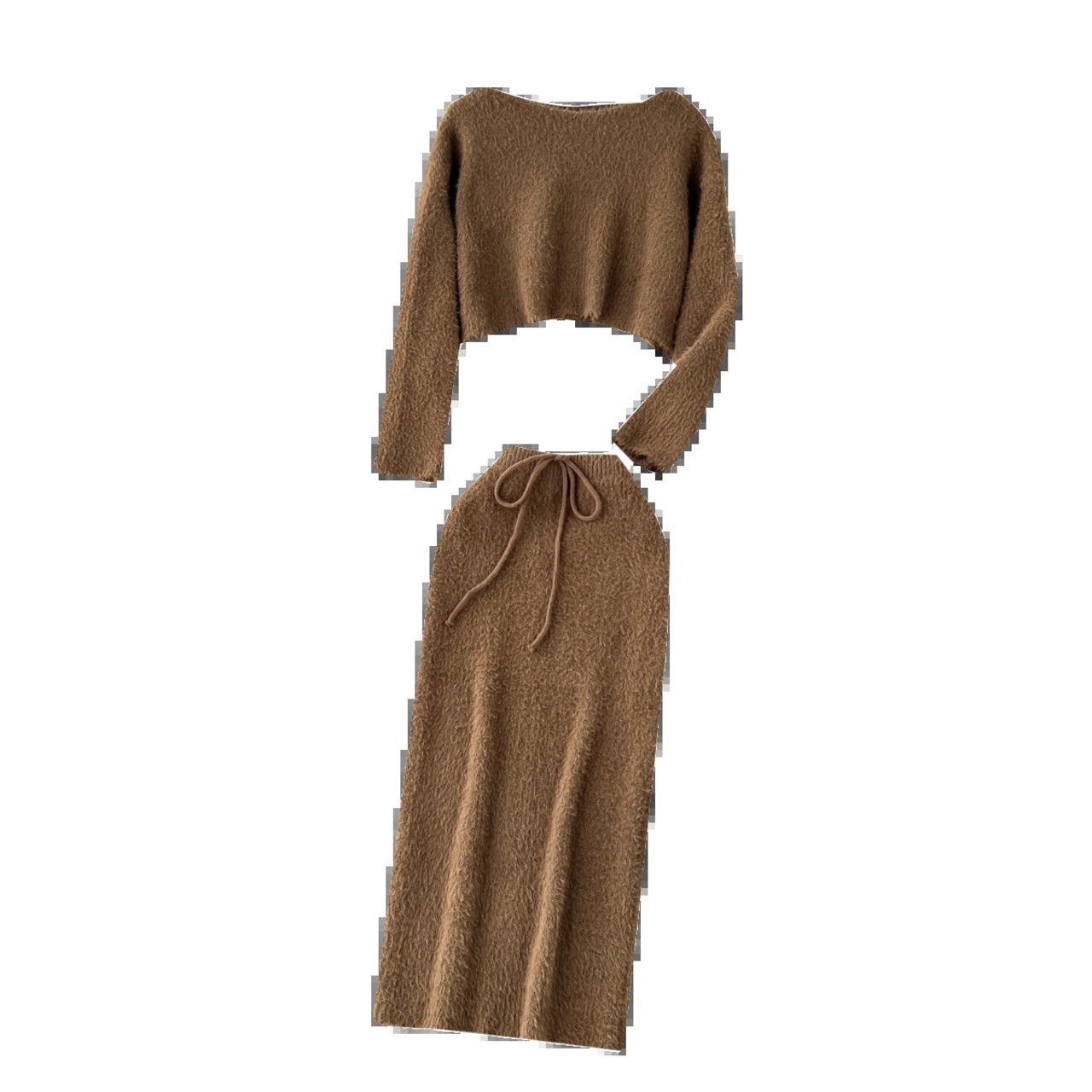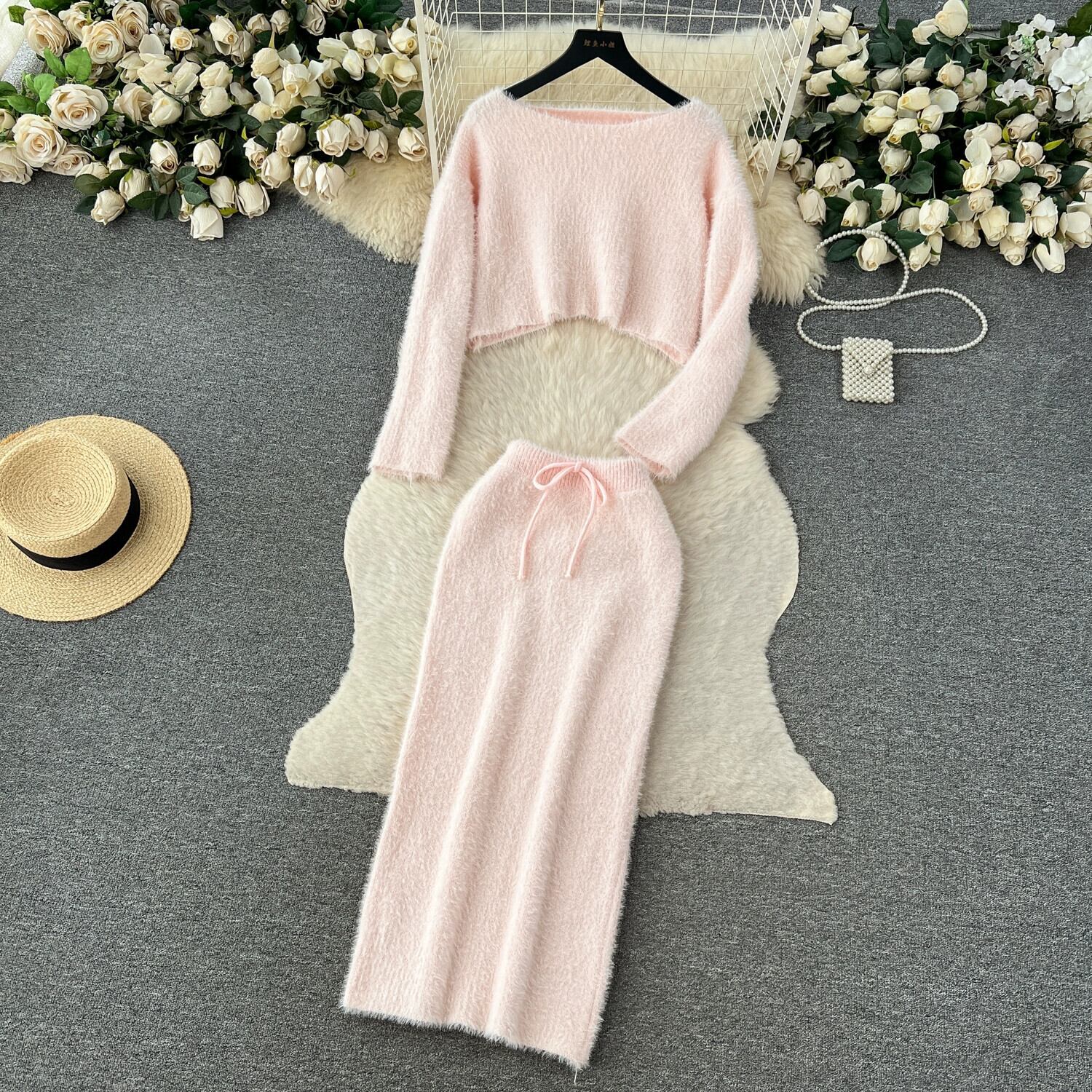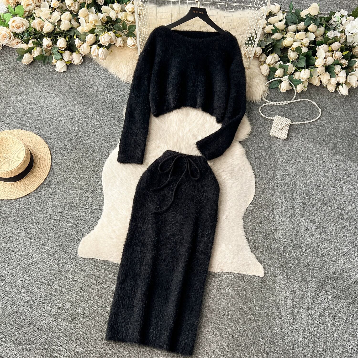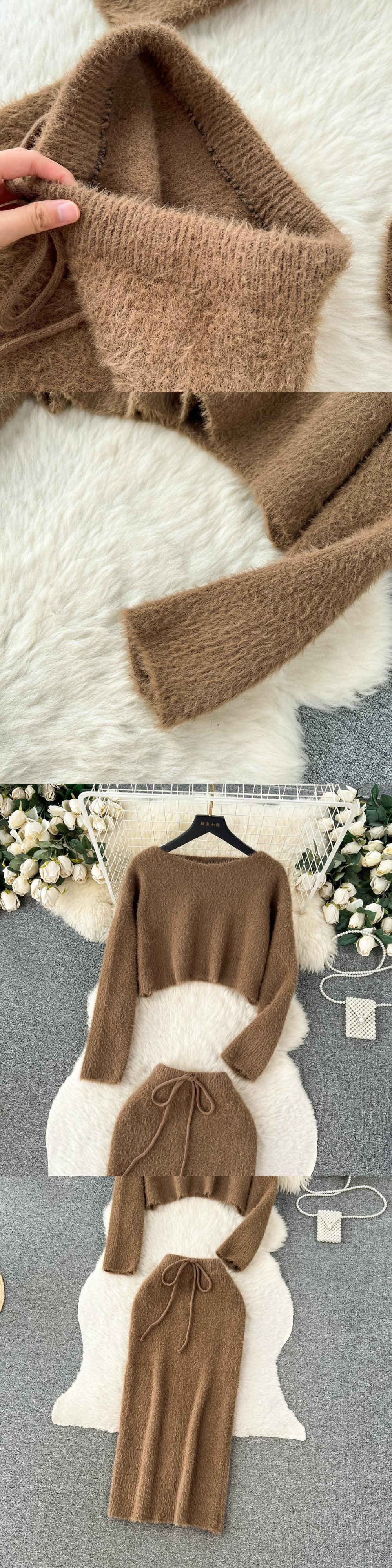 秋と冬のメイラード衣装の女性のシックなショートソフトワックス状ニットトップ + ウエストバッグヒップスカート純粋な欲望のスーツ オータム 秋物 ウィンター 冬物 ピュア lyxaj37179268826