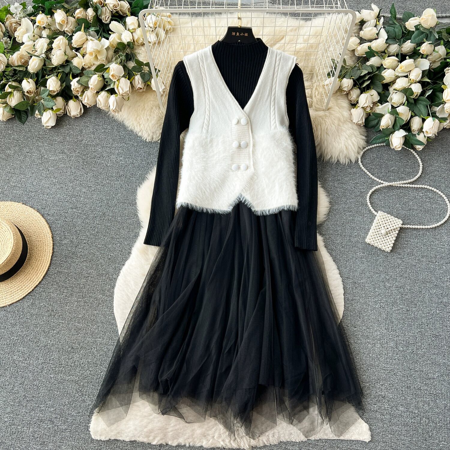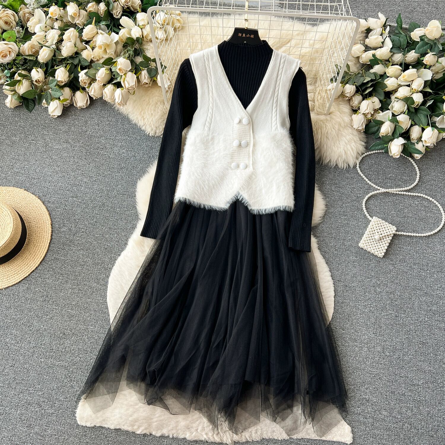 小さな香りのスタイルのファースプライシングベスト+ウエスト痩身メッシュスプライシングニットドレスを備えた秋と冬の女性に適したスーツ オータム 秋物 ウィンター 冬物 lyxaj61534058839