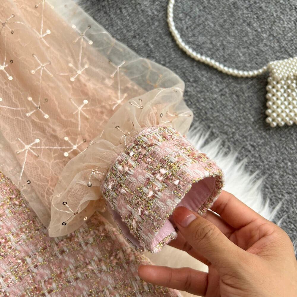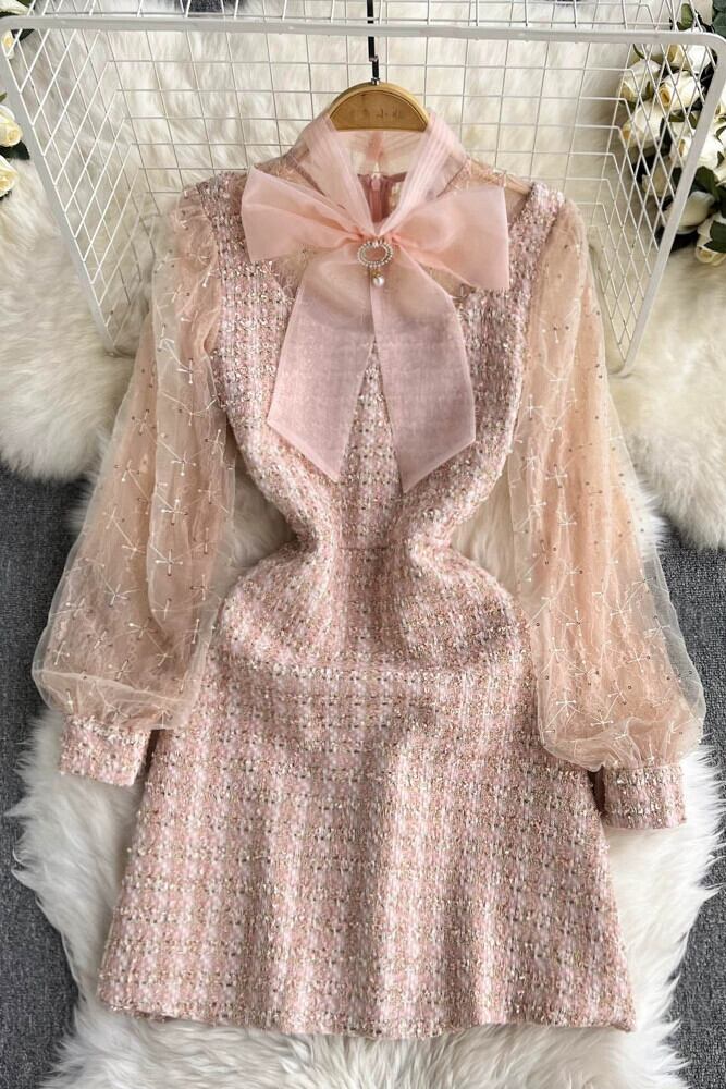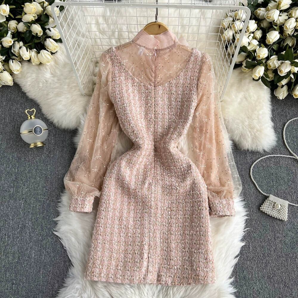 秋スタイル小さな香りのスタイルスタンドアップカラーリボンミッドレングスレースメッシュ袖スプライシングツイードフェイクツーピースドレス女性 オータム 秋物 lyxaj17742053275