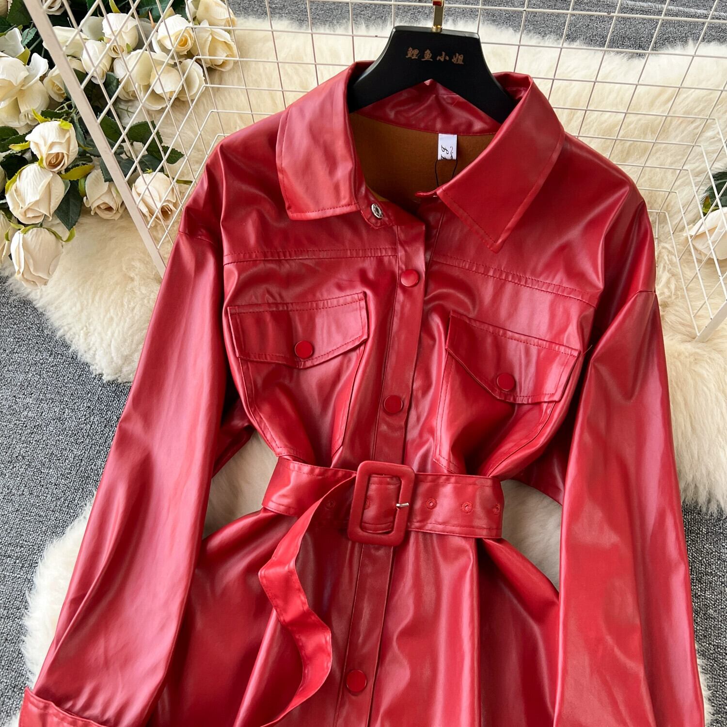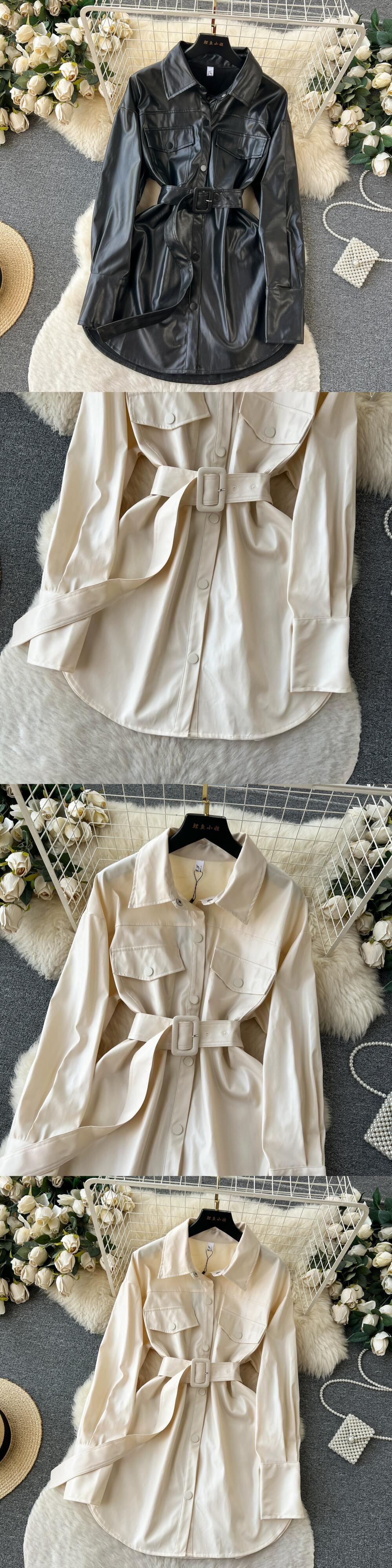 香港スタイルのレトロシックなミドル丈のレザージャケットの女性の秋のルーズレースアップウエストファッションシンプルなドレストレンディ オータム 秋物 lyxaj53060558798