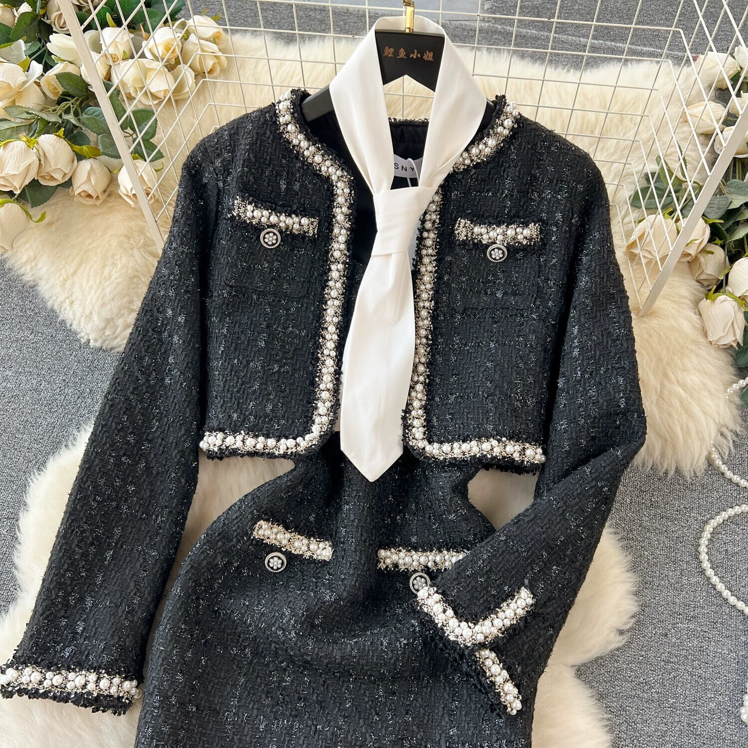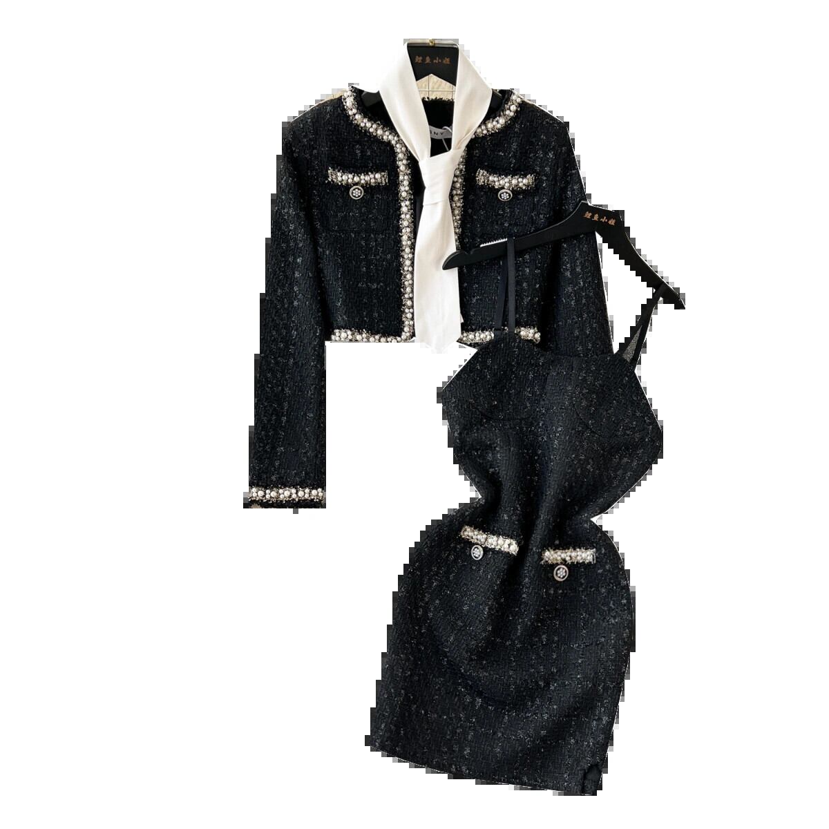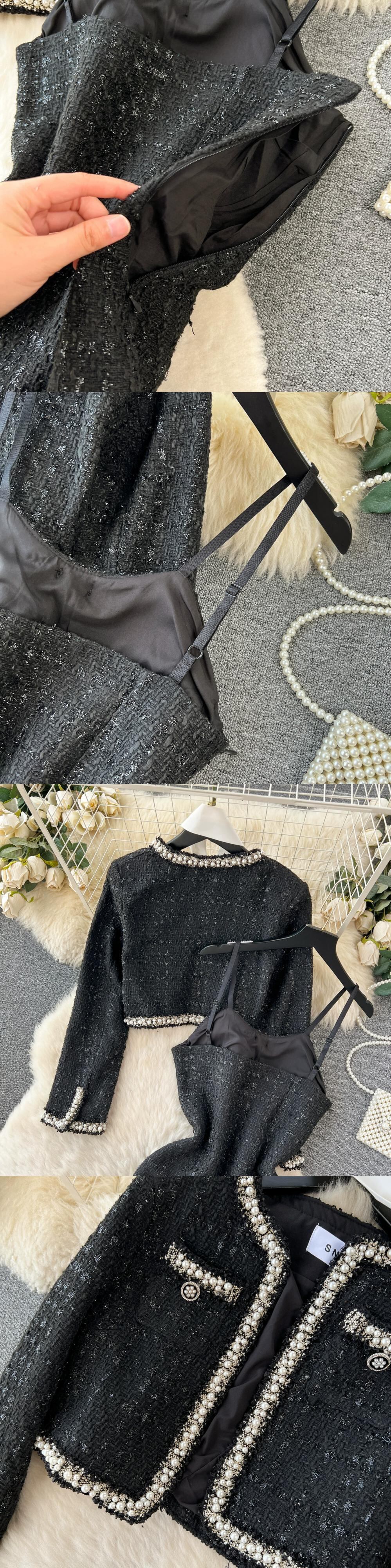 秋と冬の小さな香りスタイルツイードスーツ女性シックなファッションショートビーズジャケットサスペンダーヒップショートスカート 2 点セット オータム 秋物 ウィンター 冬物 lyxaj80216269329