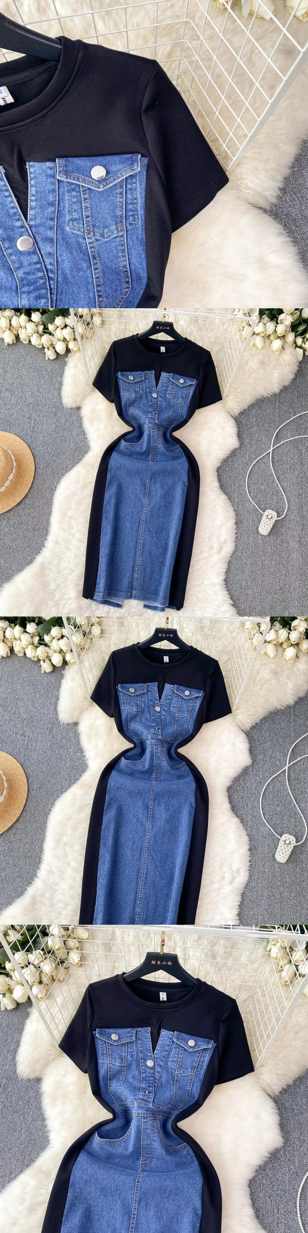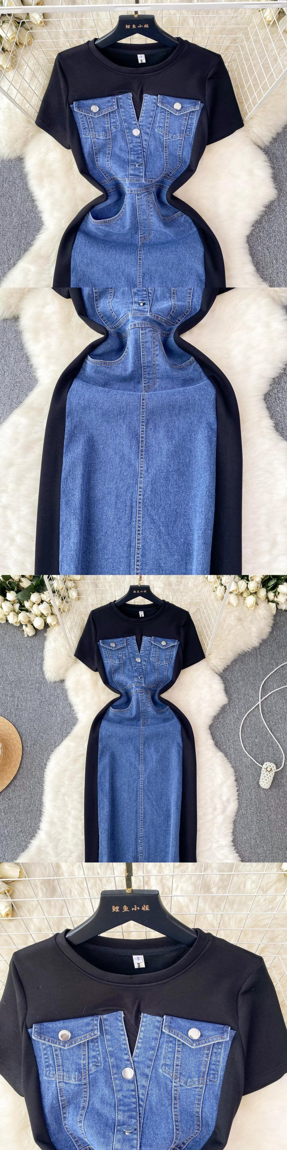 2023 インターネットセレブの新しいニッチラウンドネック半袖スプライシングデニムドレス女性のハイエンドウエストフェイクツーピースロングスカート Oネック lyxaj91682450363