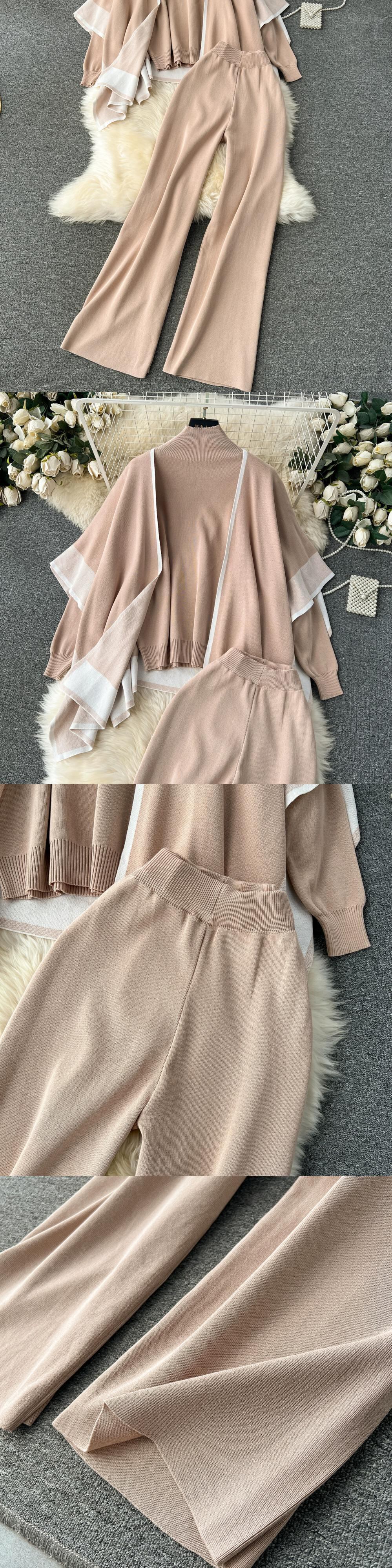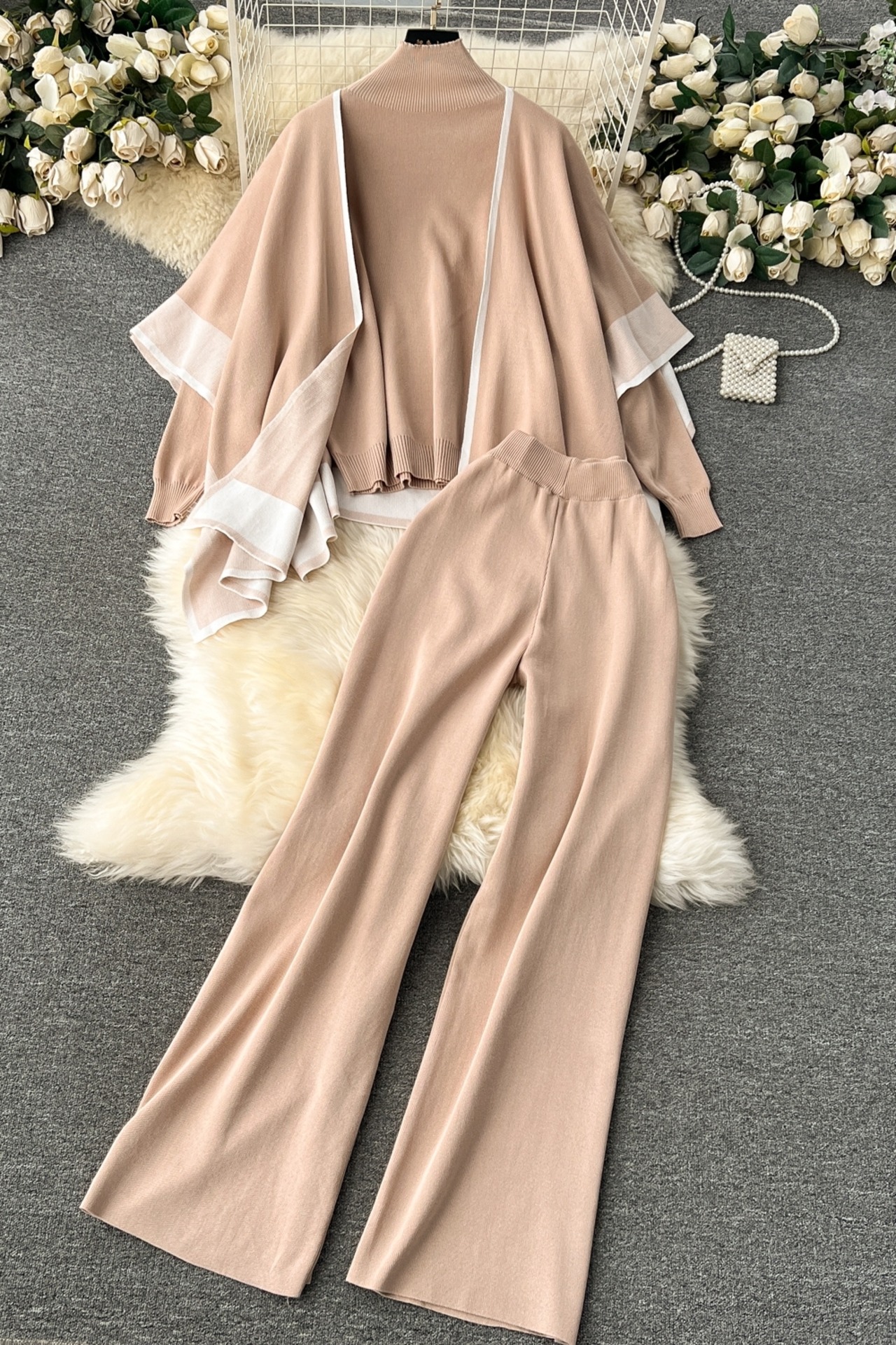秋冬ゆったり怠惰なスタイルショールケープコートハイカラープルオーバーセーターセーターカジュアルワイドレッグパンツ3点セット オータム 秋物 ウィンター 冬物 ワイドパンツ lyxaj49245433148