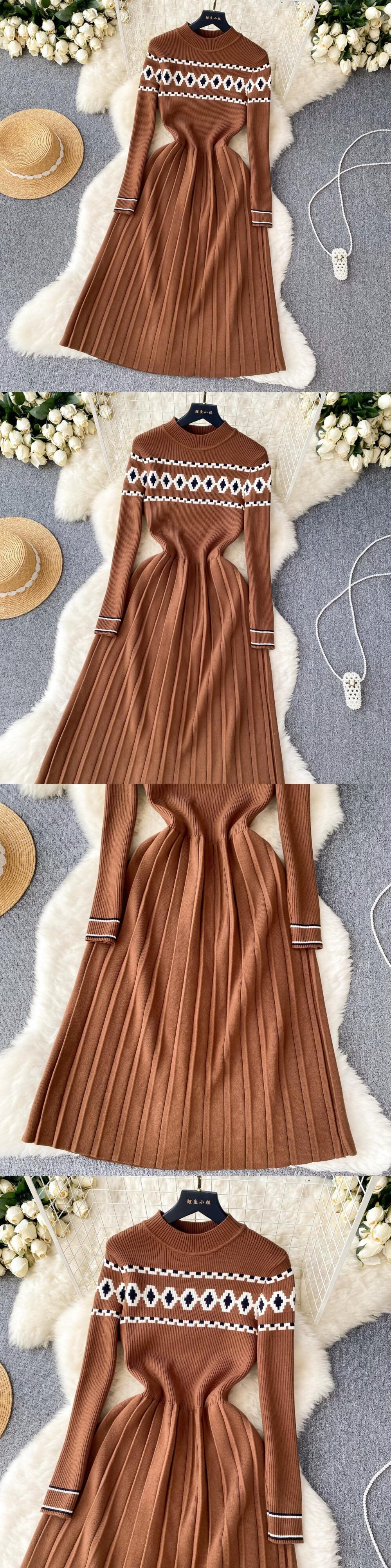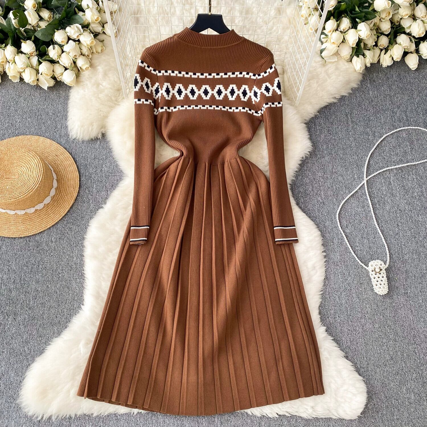 ミッドレングスニットドレスの女性の秋と冬の新しいハイエンドの気質ラウンドネックウエスト痩身長袖インナーセータードレス ロング オータム 秋物 ウィンター 冬物 Oネック lyxaj52208712396