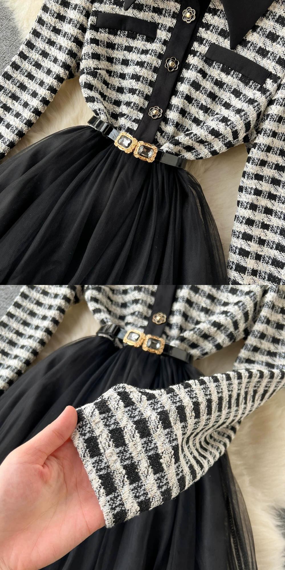 -エンド小さな香りのよいスタイルスプライシングメッシュコントラストドレス女性2023秋長袖膝丈スカート ロング オータム 秋物 lyxaj2222170988