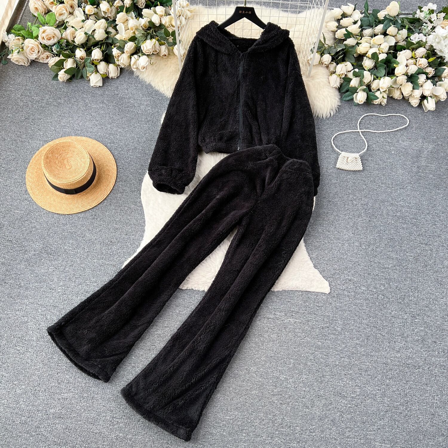 甘くてかわいいぬいぐるみ肥厚暖かいジッパーフード付きコート女性弾性ハイウエストロングパンツ秋と冬のツーピースセット エラスティック 伸縮 大人ガーリー スウィート キュート カジュアル オータム 秋物 ウィンター 冬物 lyxaj9468997867